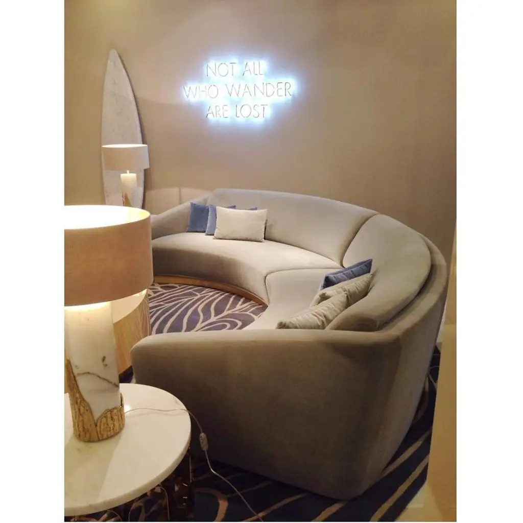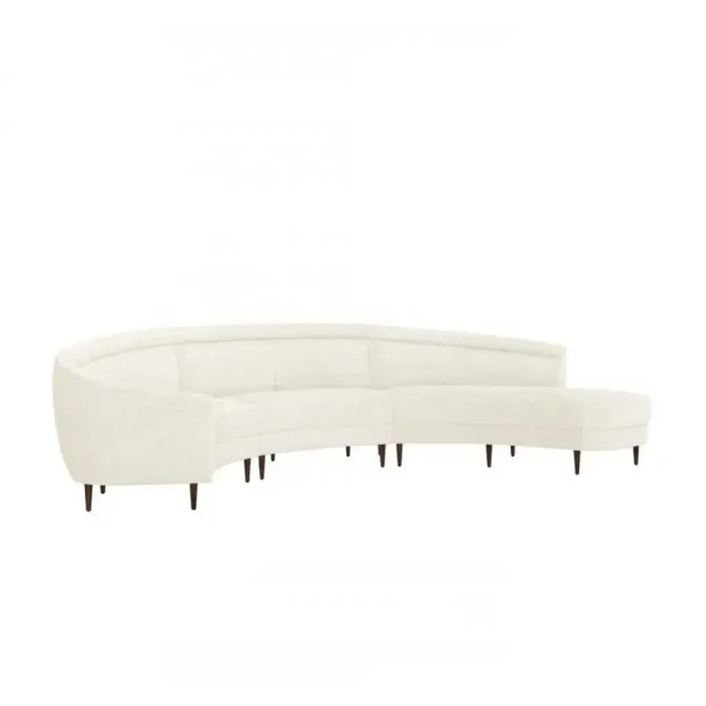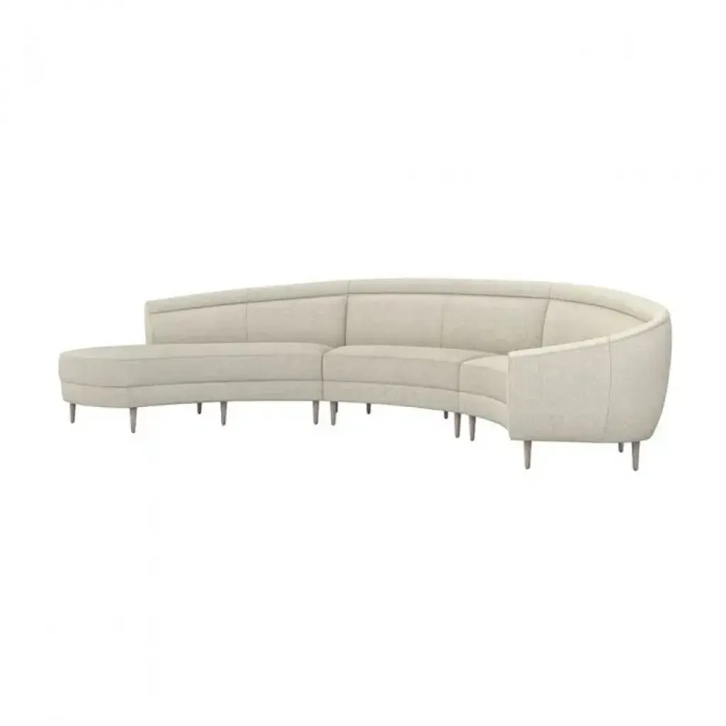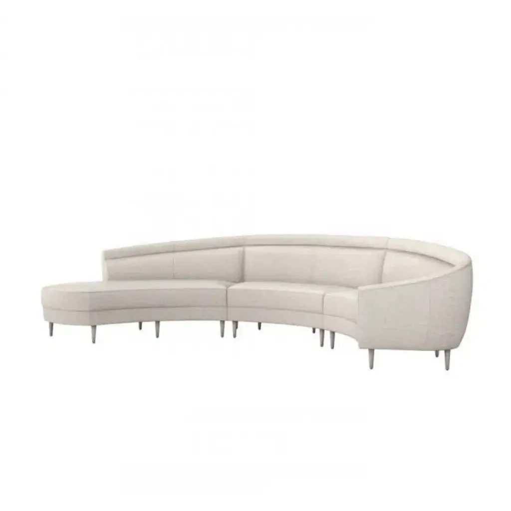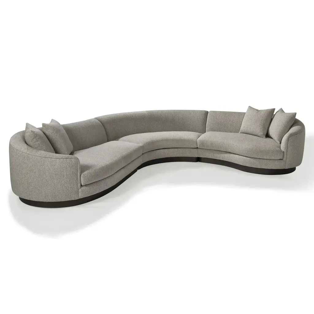 The handmade sofa is the representation of magnetism. Featuring tailored upholstery in light grey cotton velvet and a stylish brushed brass footer, it is masterfully crafted with an emphatic, yet elegant, curved contour. The sofa is a statement piece that exudes effortless charisma.Frame in solid wood.Foam in 100% PU with BS standard fire specifications.Foam in American Standard CAL 117 for the USA.Upholstery with upholster straps.Handmade in Europe.Dimensions:W 350 cm 137.8”D 185 cm 72.8”H 80 cm 31.5”SH 41 cm 16.1”AH 56 cm 22.1”.Contact us to enquire about COM/COL production, requirements and material shipping instructions.Please contact us if you have any questions about customization and pricing. We will be glad to check with the factory’s technical team if sizes, finishes, and colors can be customized. We do our best to expedite production and to ship and deliver product within the listed lead time, however current lead times might be longer due to global shipping backlog and delays. These delays are out of our control and cannot be a reason to cancel an order.Our pricing includes all costs for international shipping to the U.S., as well as duties and customs clearance fees. Please be aware that local delivery within the U.S. is not included. We offer white glove, front door, and warehouse delivery options. For shipments outside the U.S., kindly reach out to us for a detailed quote.