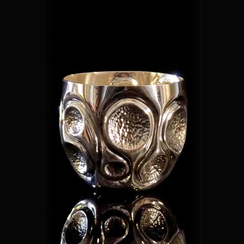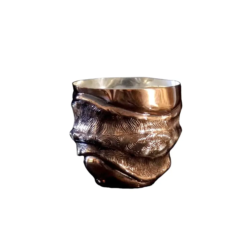 Embrace artistic luxury with this Artisan Handcrafted Copper Cup, a stunning fusion of form and function. The sculptural design features bold, fluid shapes that mimic the natural flow of molten metal, making this cup a true conversation piece. Expertly crafted from 1.2mm thick copper and coated in a lustrous 999 sterling silver layer, it offers both durability and elegance. The intricate texture and unique surface pattern catch the light beautifully, enhancing the cup's striking aesthetic.