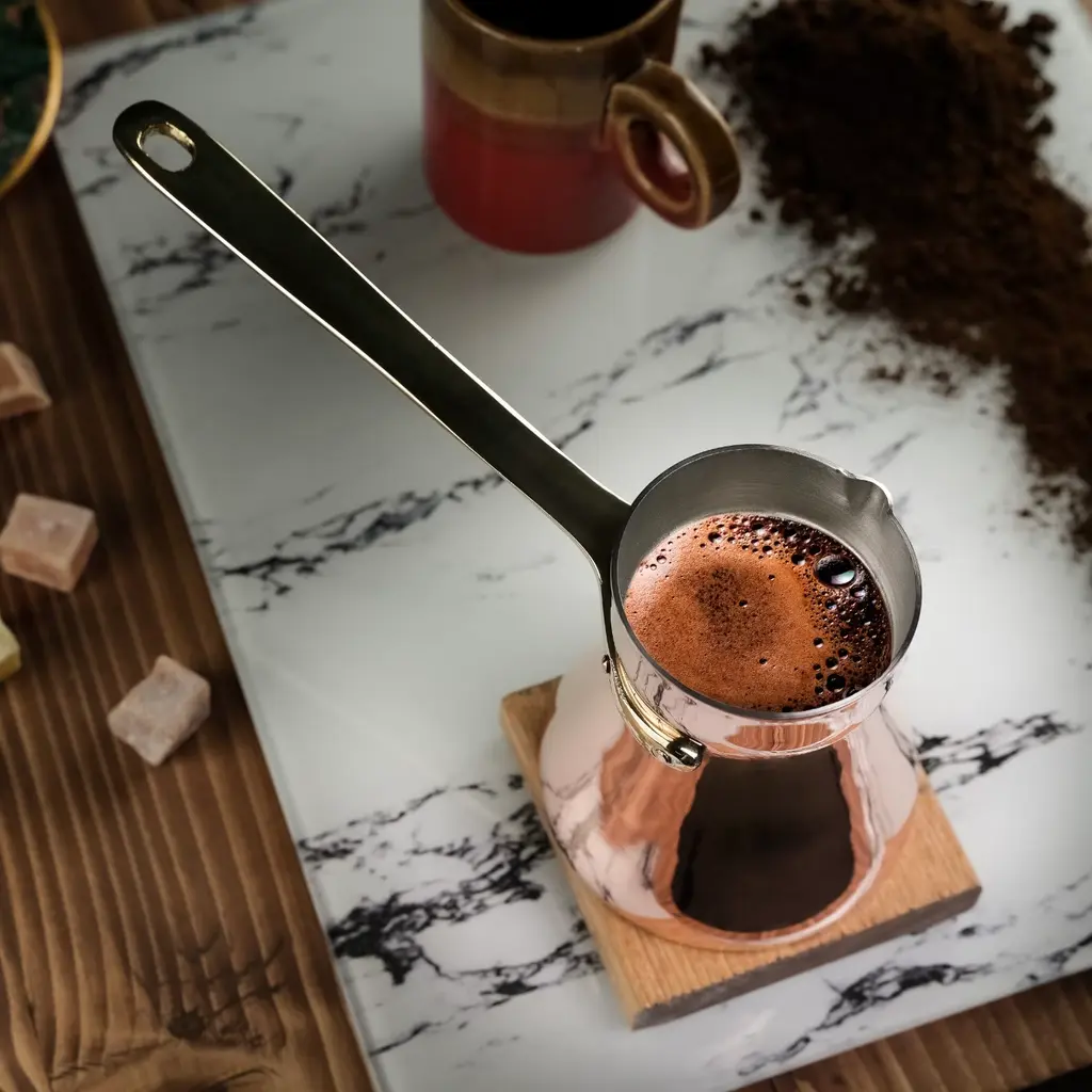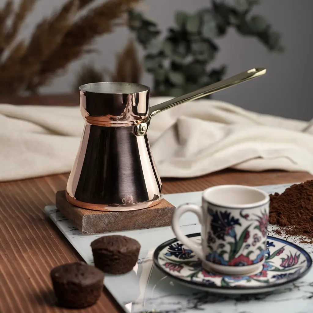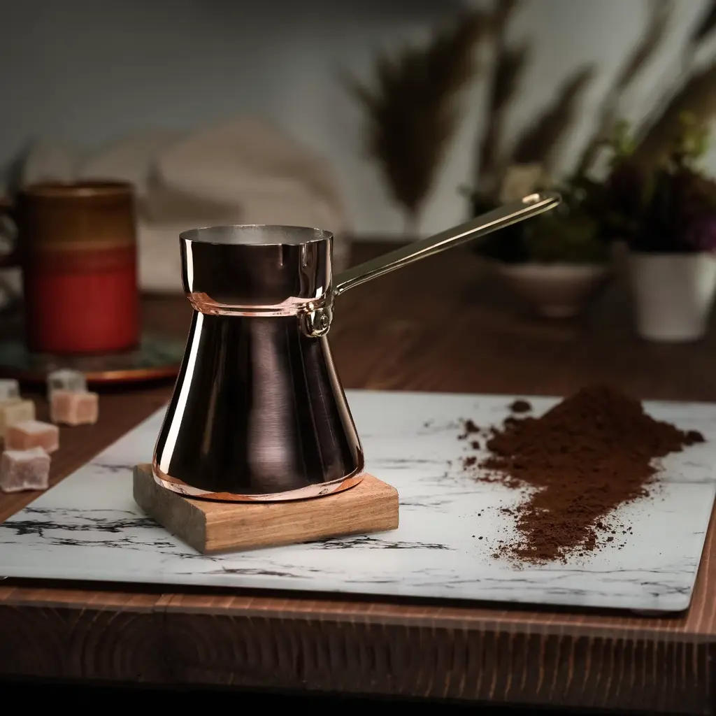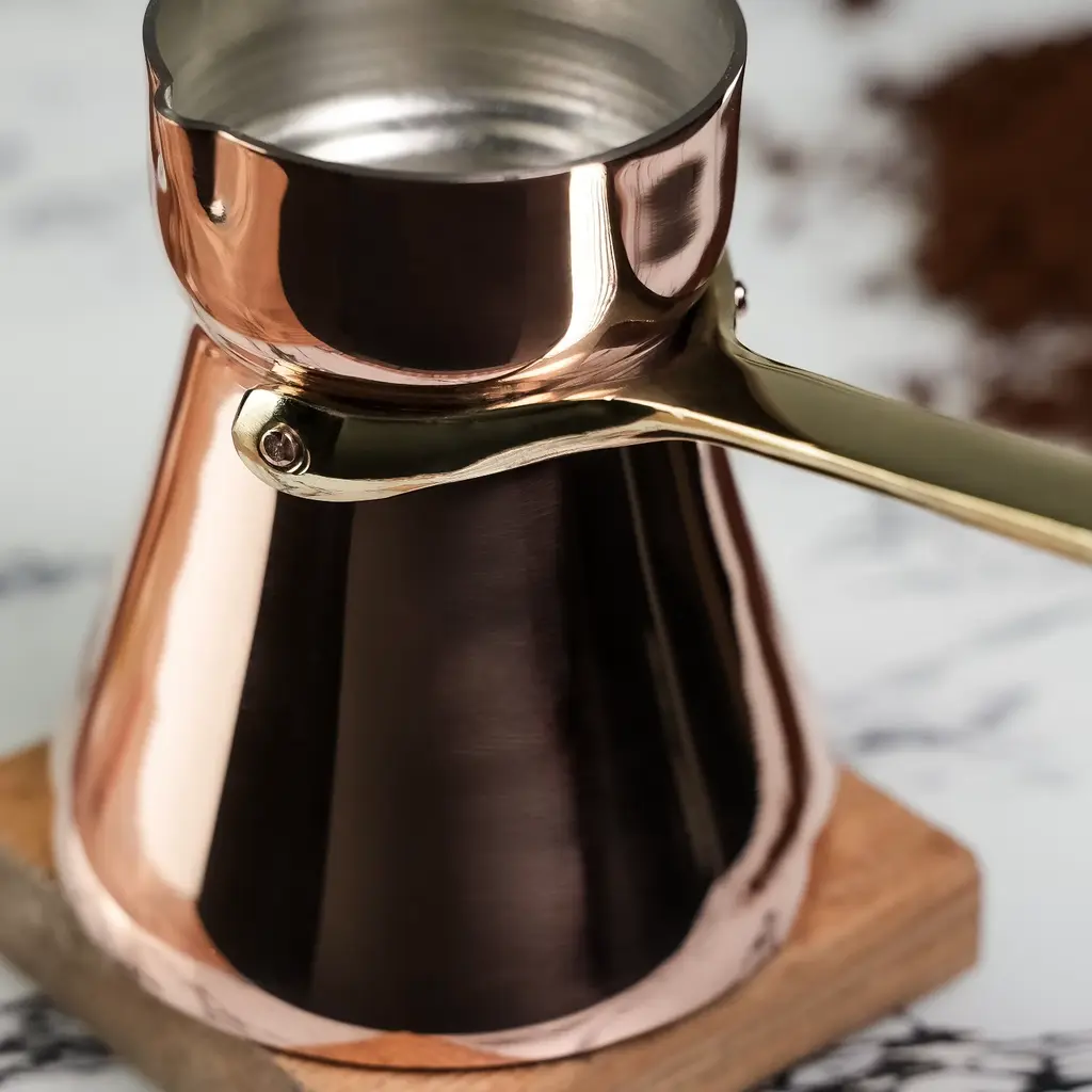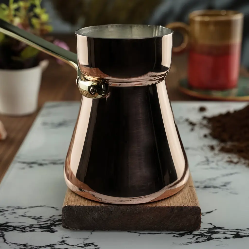 Handcrafted from high-quality, solid copper with an interior lining of food-safe tin. The tin lining ensures the pot is safe for cooking and serving. Elevate your coffee ritual with this exquisitely handcrafted copper coffee pot, designed for the perfect brew every time. Inspired by traditional Turkish coffee makers, this piece offers both form and function. The hammered copper body not only adds a rustic charm but also ensures optimal heat distribution for a rich, flavorful coffee experience. The smooth wooden handle provides a comfortable grip and stays cool during use, making it easy to pour.