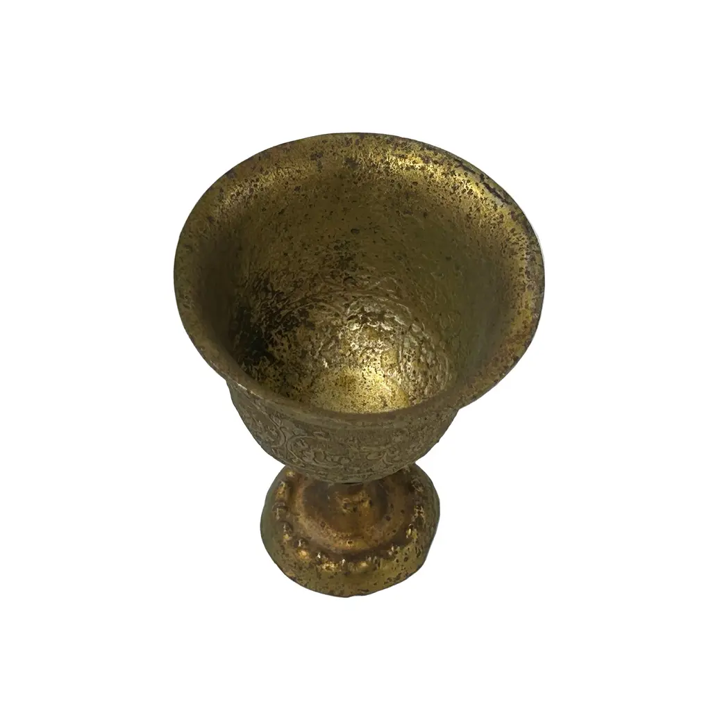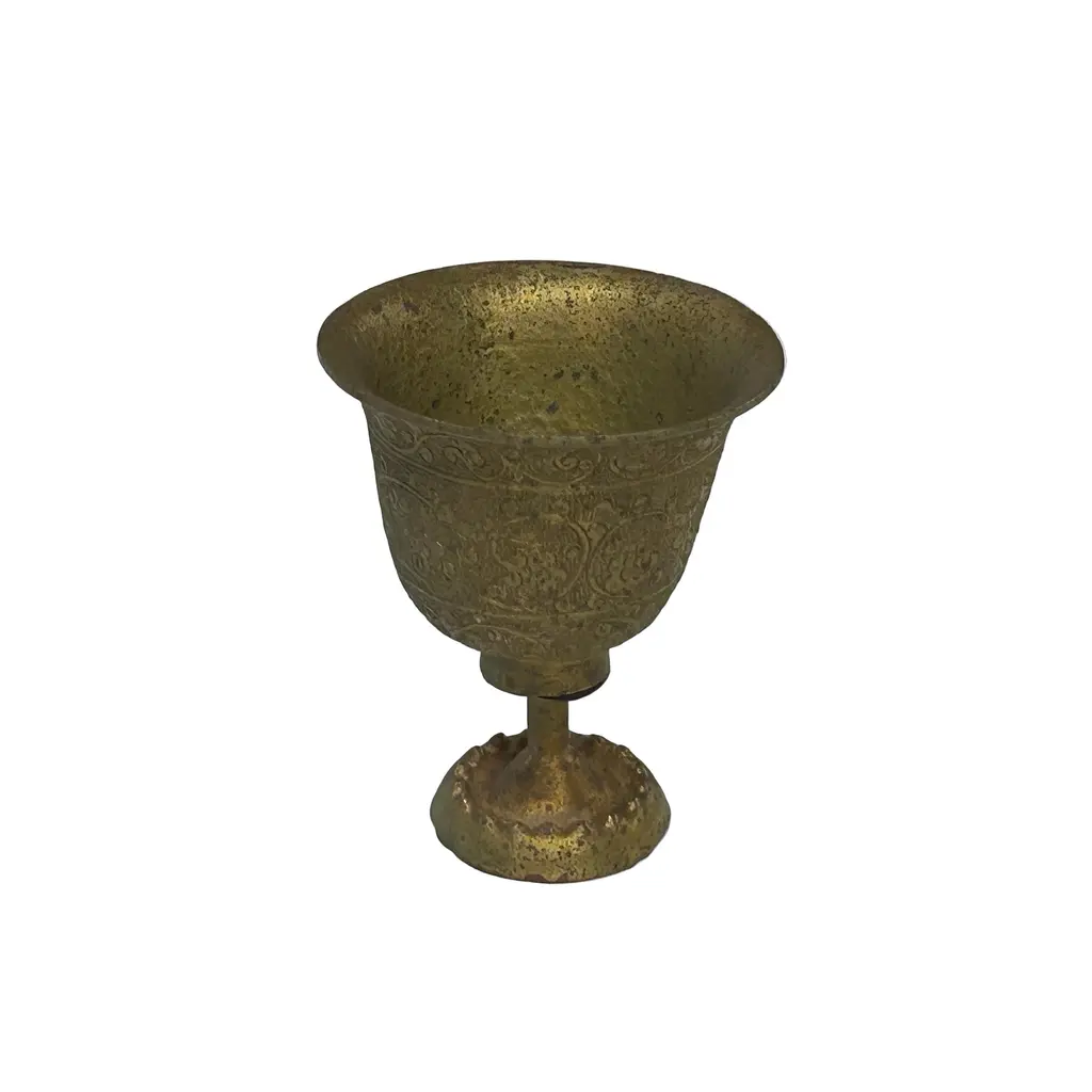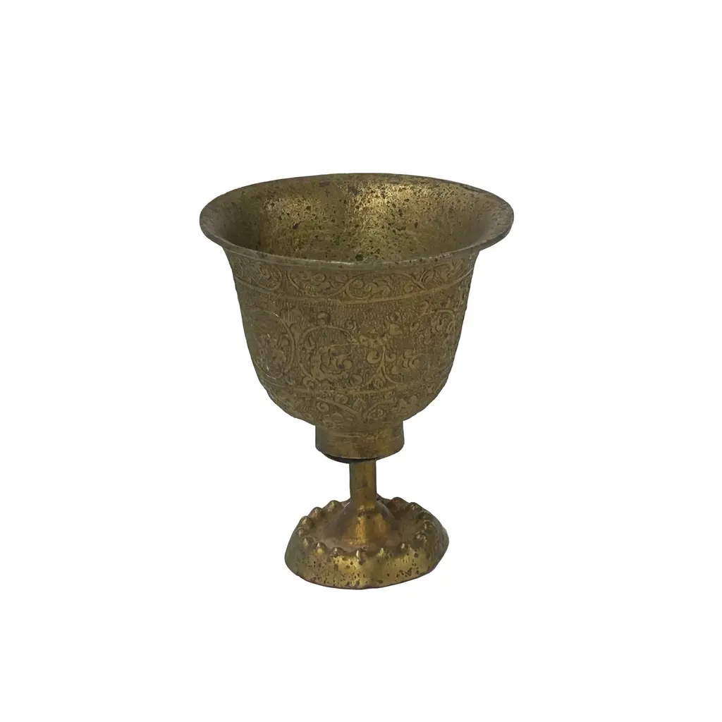 This intricately detailed brass chalice is a stunning example of antique craftsmanship, with a rich, golden patina that speaks of its history. The body of the cup is adorned with a delicate, embossed floral and vine pattern, adding a touch of elegance and sophistication. Supported by a slender stem and a circular, textured base, the goblet's design is both graceful and stable. Its aged and slightly worn surface gives it an authentic, rustic charm, making it a perfect decorative piece for collectors of vintage and unique home decor. Whether displayed on a shelf, used as a prop, or simply admired for its beauty, this piece is a testament to timeless artistry. Not For Serving use. Dimensions: Dia 2" x h3" Origin: China Material: Metal Condition: Vintage handmade finish, rust exist, variation in marks, minor crooked For all USA domestic continental customers (from 48 states), there is a flat shipping fee of $20, which includes insurance and handling charges