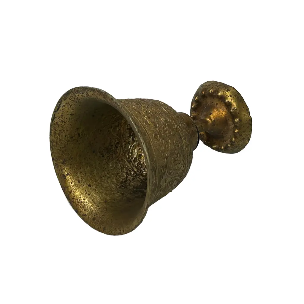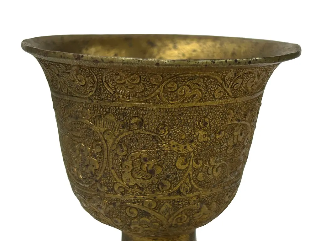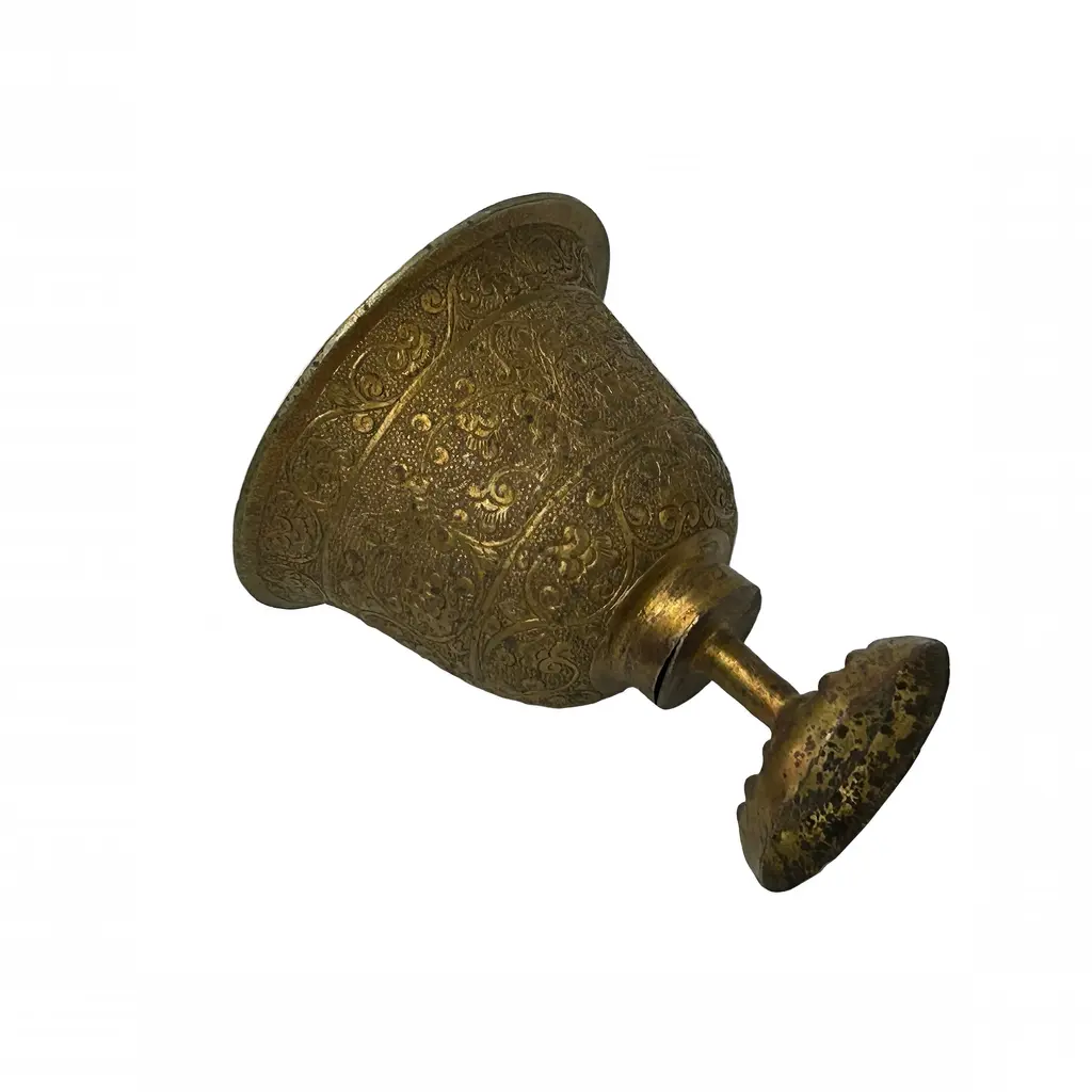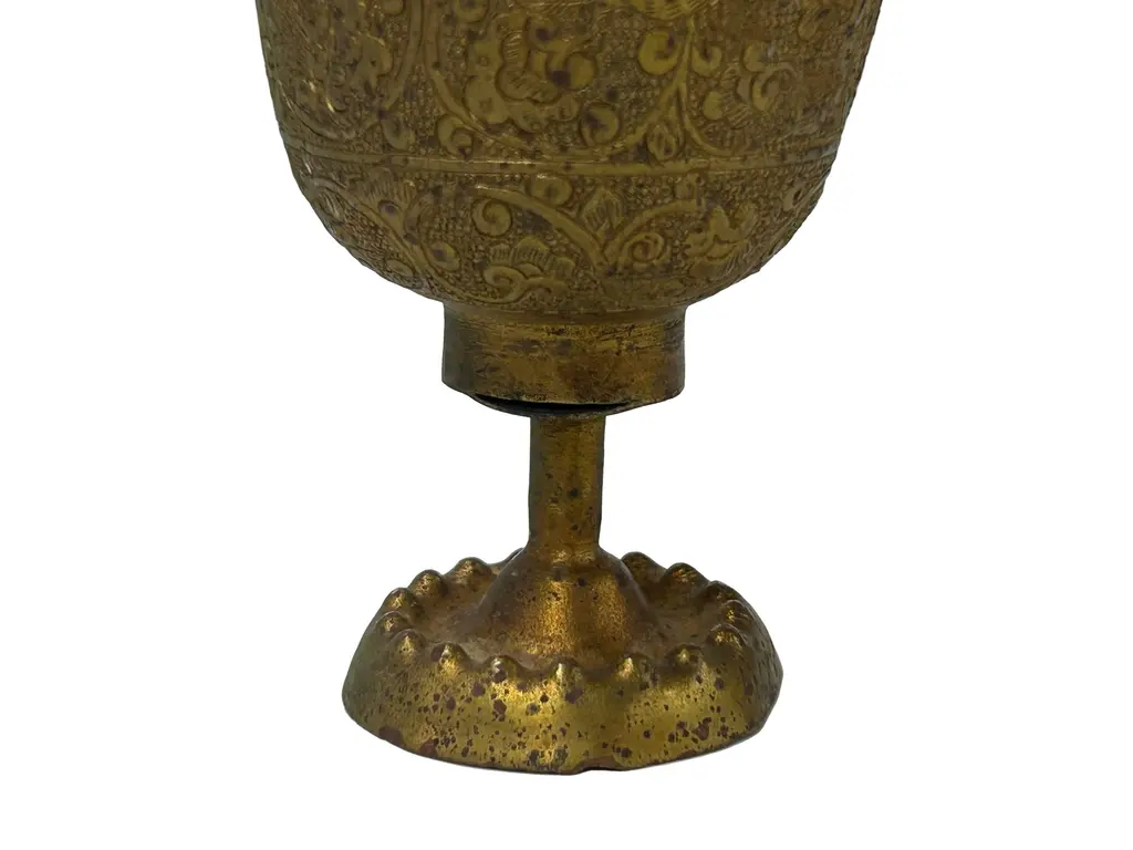 This intricately detailed brass chalice is a stunning example of antique craftsmanship, with a rich, golden patina that speaks of its history. The body of the cup is adorned with a delicate, embossed floral and vine pattern, adding a touch of elegance and sophistication. Supported by a slender stem and a circular, textured base, the goblet's design is both graceful and stable. Its aged and slightly worn surface gives it an authentic, rustic charm, making it a perfect decorative piece for collectors of vintage and unique home decor. Whether displayed on a shelf, used as a prop, or simply admired for its beauty, this piece is a testament to timeless artistry. Not For Serving use. Dimensions: Dia 2" x h3" Origin: China Material: Metal Condition: Vintage handmade finish, rust exist, variation in marks, minor crooked For all USA domestic continental customers (from 48 states), there is a flat shipping fee of $20, which includes insurance and handling charges