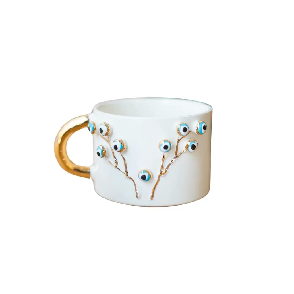 Elevate your coffee or tea experience with this stunning Evil Eye Ceramic Mug, featuring a luxurious 24k gold-plated handle. The hand-painted evil eye design on smooth ceramic offers a captivating contrast to the brilliant gold, symbolizing protection and positivity. The 24k gold plating on the handle adds a touch of timeless elegance, making this mug a true statement piece, whether you're enjoying a quiet moment at home or displaying it proudly in your kitchen.