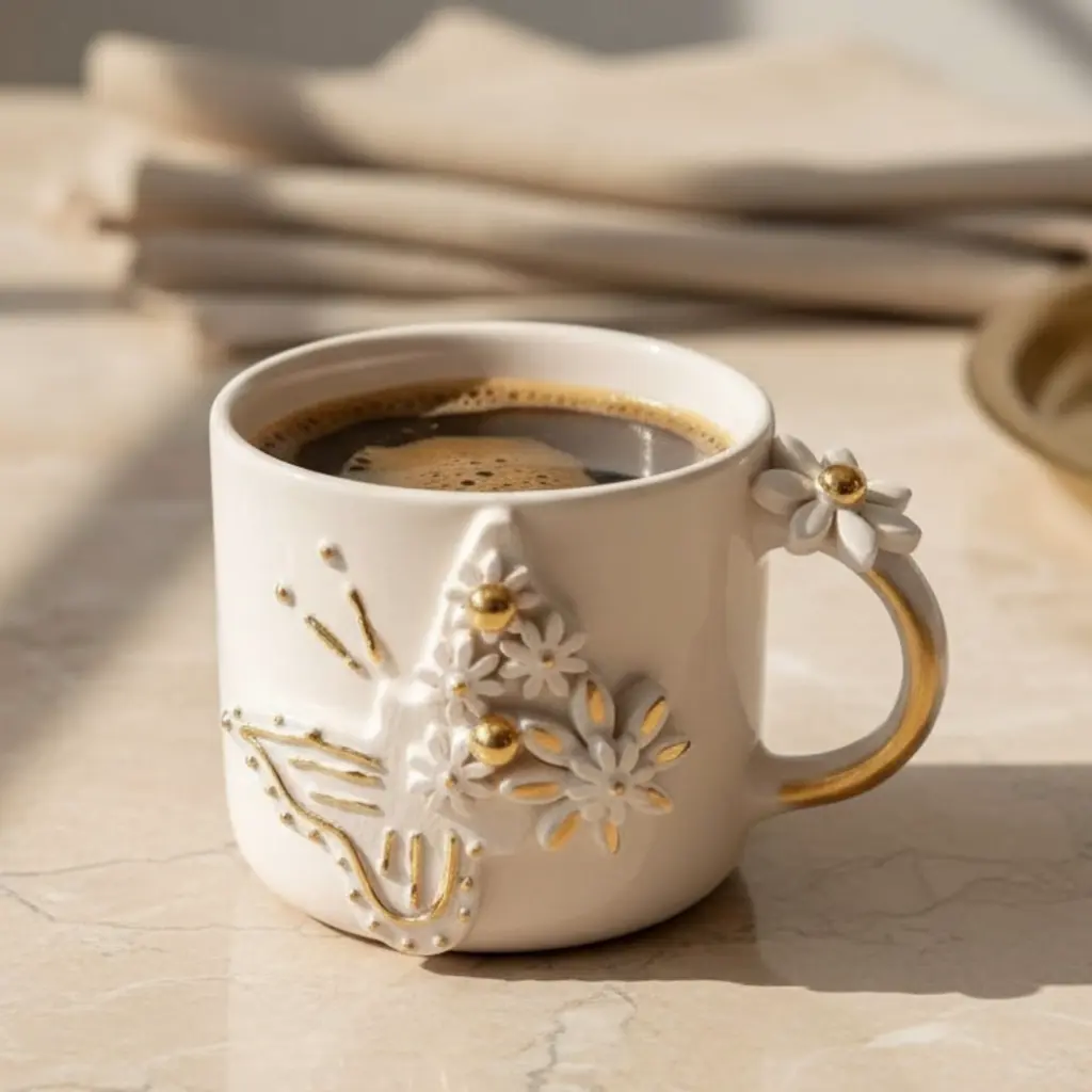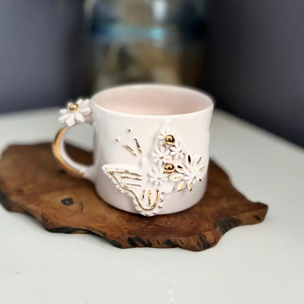 Bring a touch of nature-inspired elegance to your drinkware collection with this handmade white ceramic mug, featuring a delicate butterfly and floral design accented with 24k gold plating. Each mug is a unique piece of art, carefully crafted and hand-painted by skilled artisans. The 3D butterfly and flowers add a lovely, tactile quality, while the gleaming 24k gold details create an enchanting effect that catches the light beautifully. Perfect for adding a bit of charm to your morning coffee or tea ritual, this mug combines elegance with a playful, whimsical aesthetic. Ideal as a thoughtful gift or for anyone looking to add a luxurious accent to their everyday routines, this piece truly stands out.