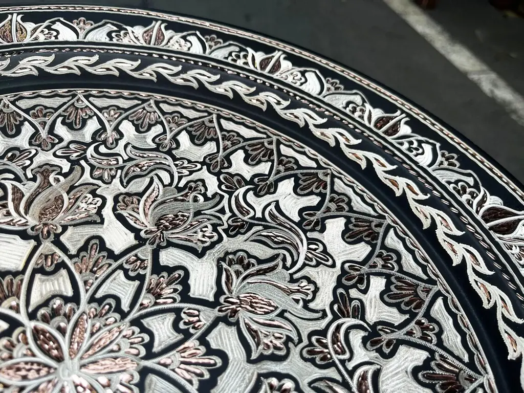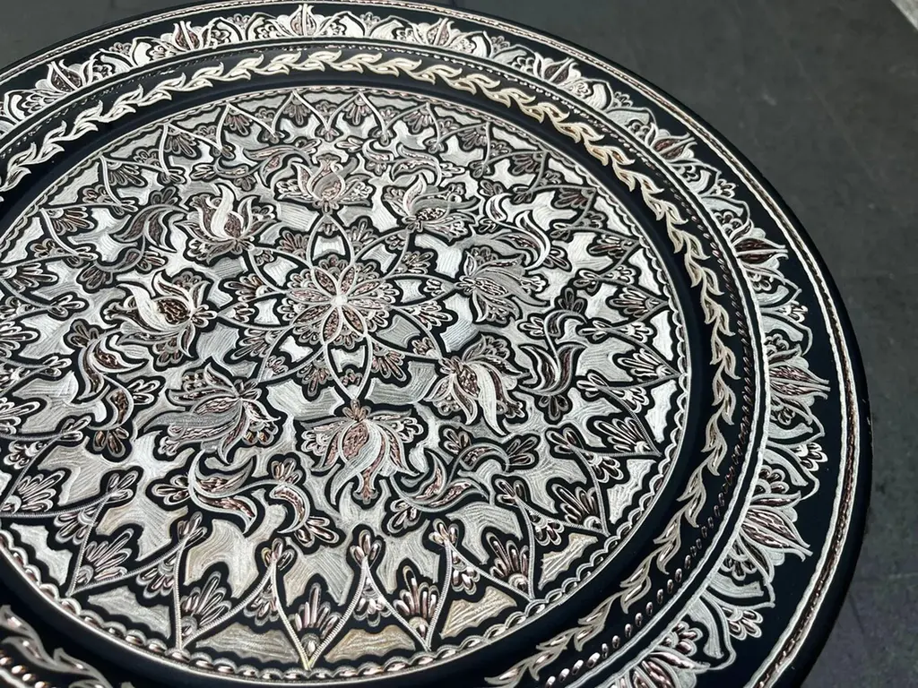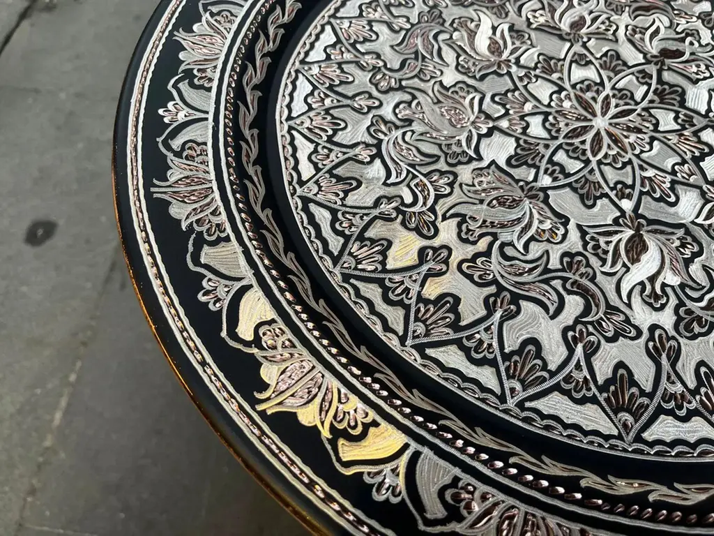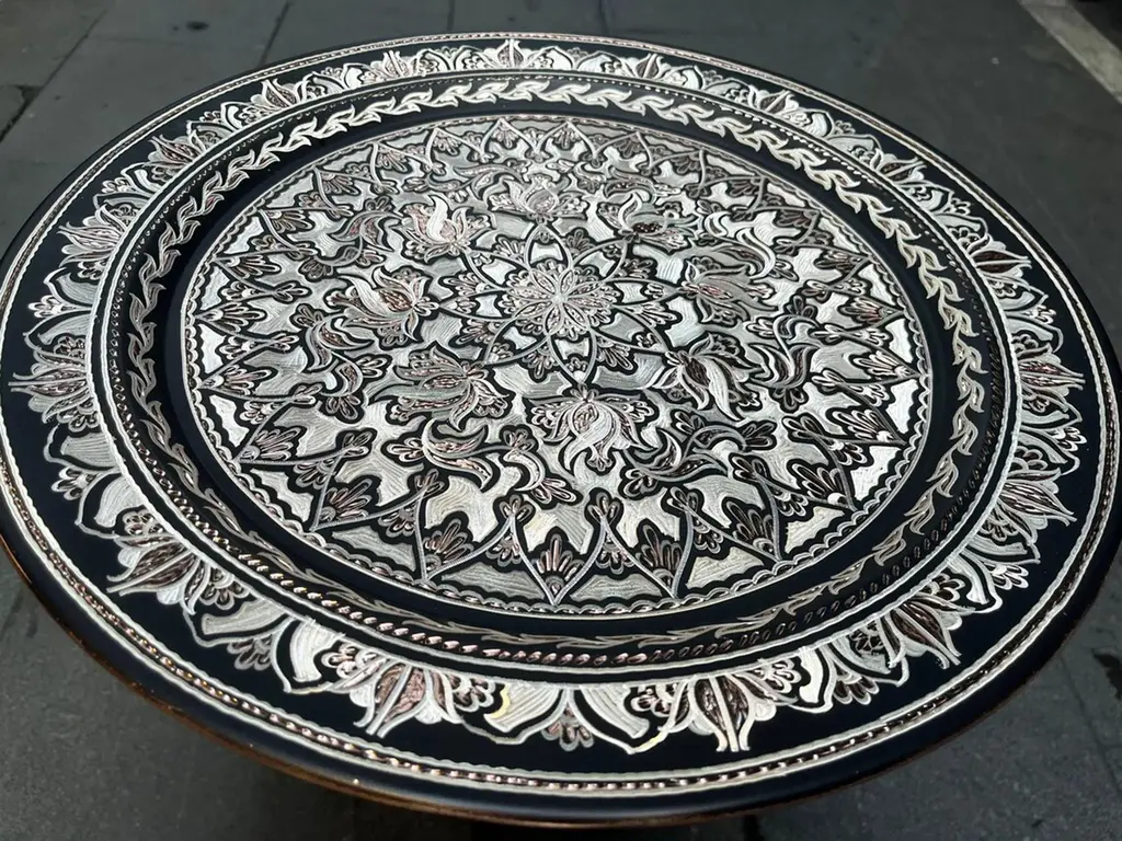 Handmade carved large wall plate made by copper. Stylish full inlaid design for wall hanging. Great for displaying your unique decoration. Engraved dish can be hung to create wonderful wall art. 52 Cm - 20 Inc There is an insert on the back of the plate for hanging. Ready to ship. Shipping is free and takes a few days via UPS, DHL, FEDEX to all around the world. If you have any questions or concerns, please let me now.
