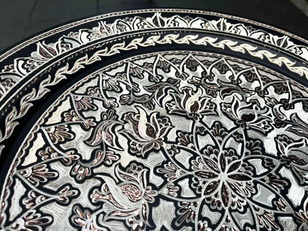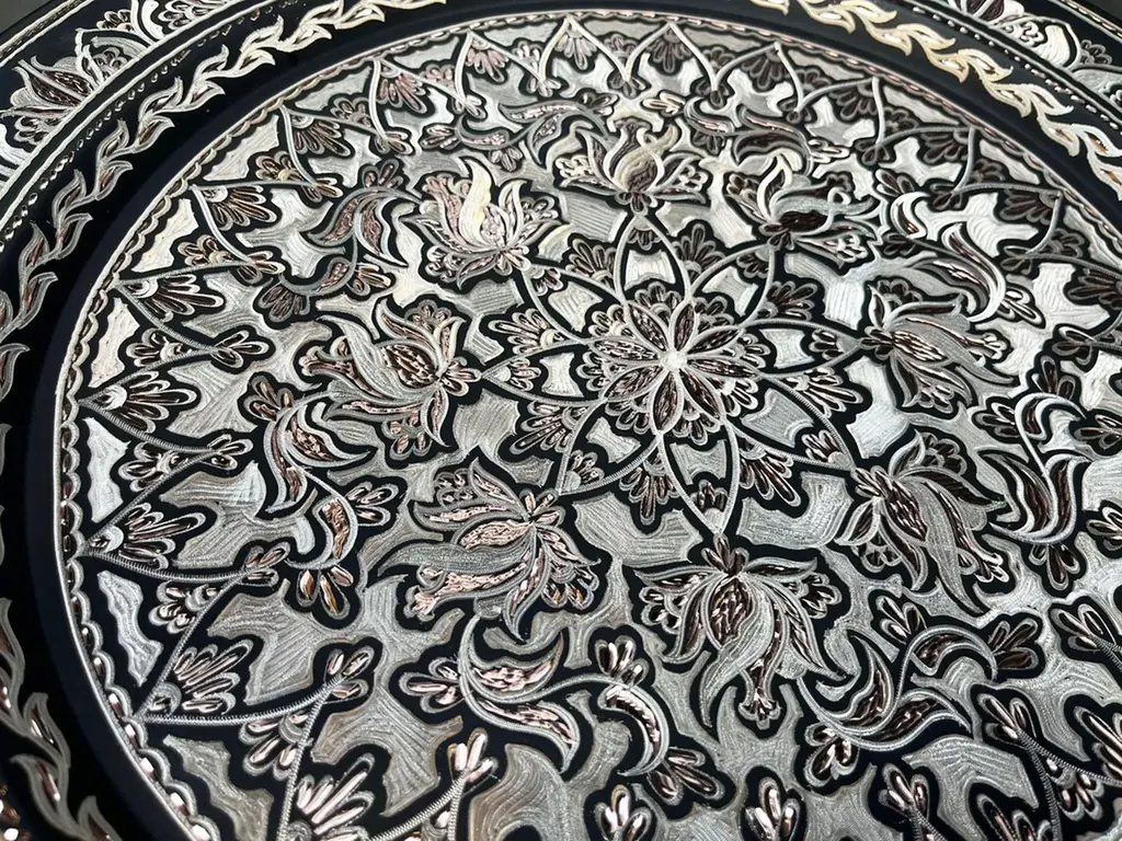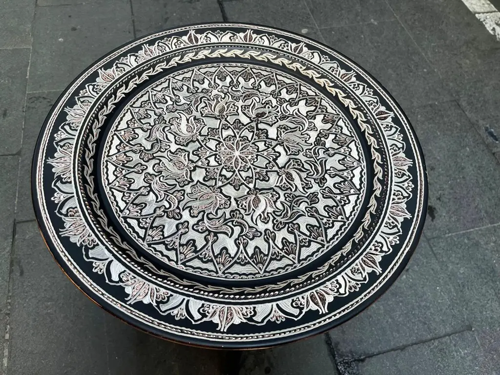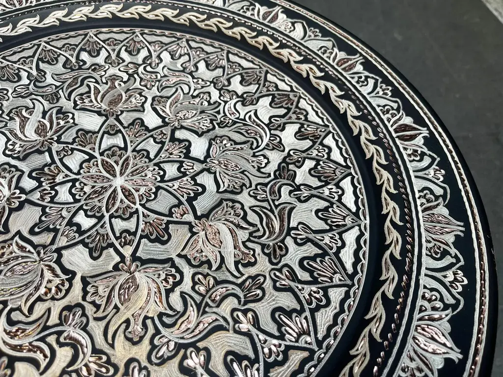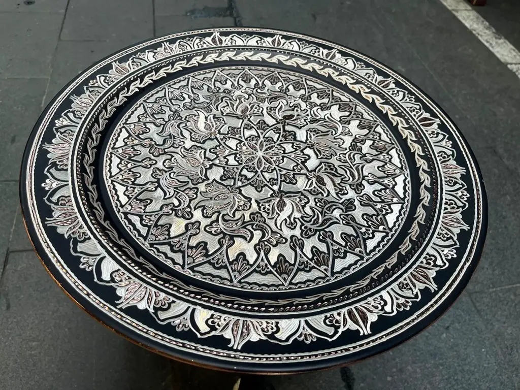 Handmade carved large wall plate made by copper. Stylish full inlaid design for wall hanging. Great for displaying your unique decoration. Engraved dish can be hung to create wonderful wall art. 52 Cm - 20 Inc There is an insert on the back of the plate for hanging. Ready to ship. Shipping is free and takes a few days via UPS, DHL, FEDEX to all around the world. If you have any questions or concerns, please let me now.