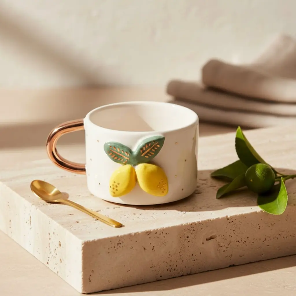 Add a zest of sunshine to your day with the Lemon Grove Mug, a beautifully crafted ceramic piece that embodies the spirit of a citrus orchard. This playful mug features a charming 3D design with vibrant yellow lemons and detailed green leaves, hand-painted for a lifelike touch. The luxurious 24ct gold handle elevates the design, bringing a touch of elegance and sophistication that perfectly complements the cheerful lemon motif. Ideal for those who appreciate both style and whimsy, this mug is a delightful way to enjoy your favorite hot drinks.