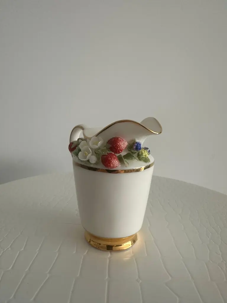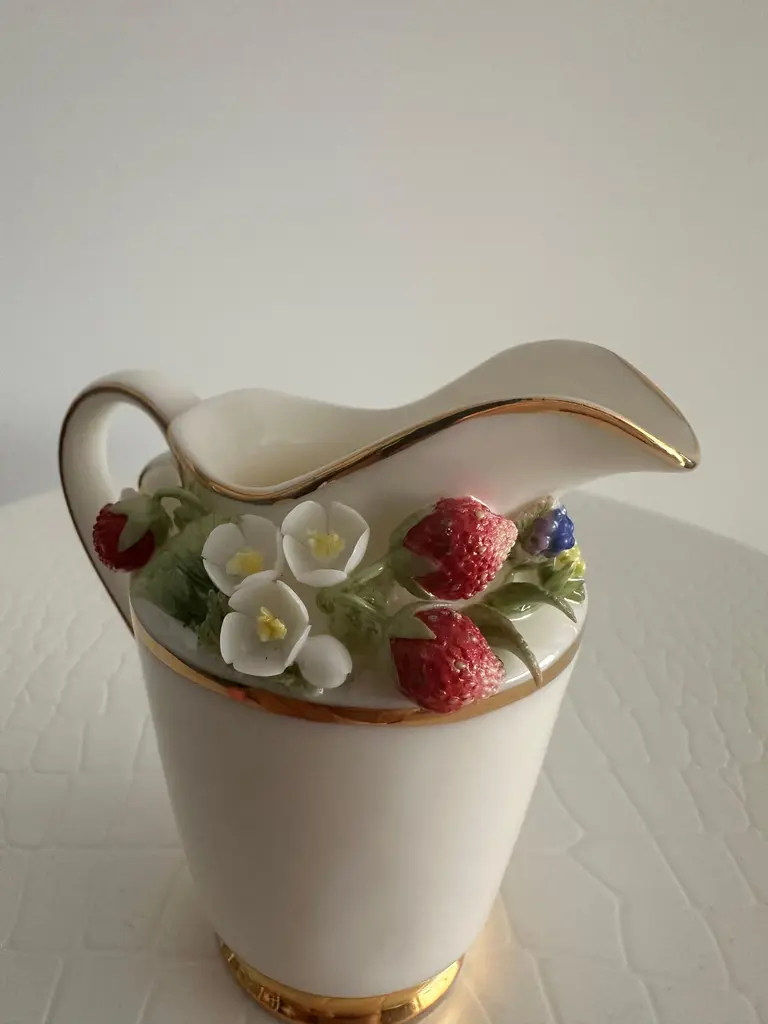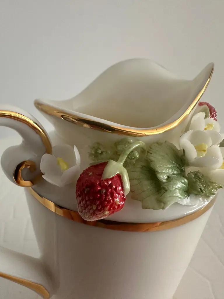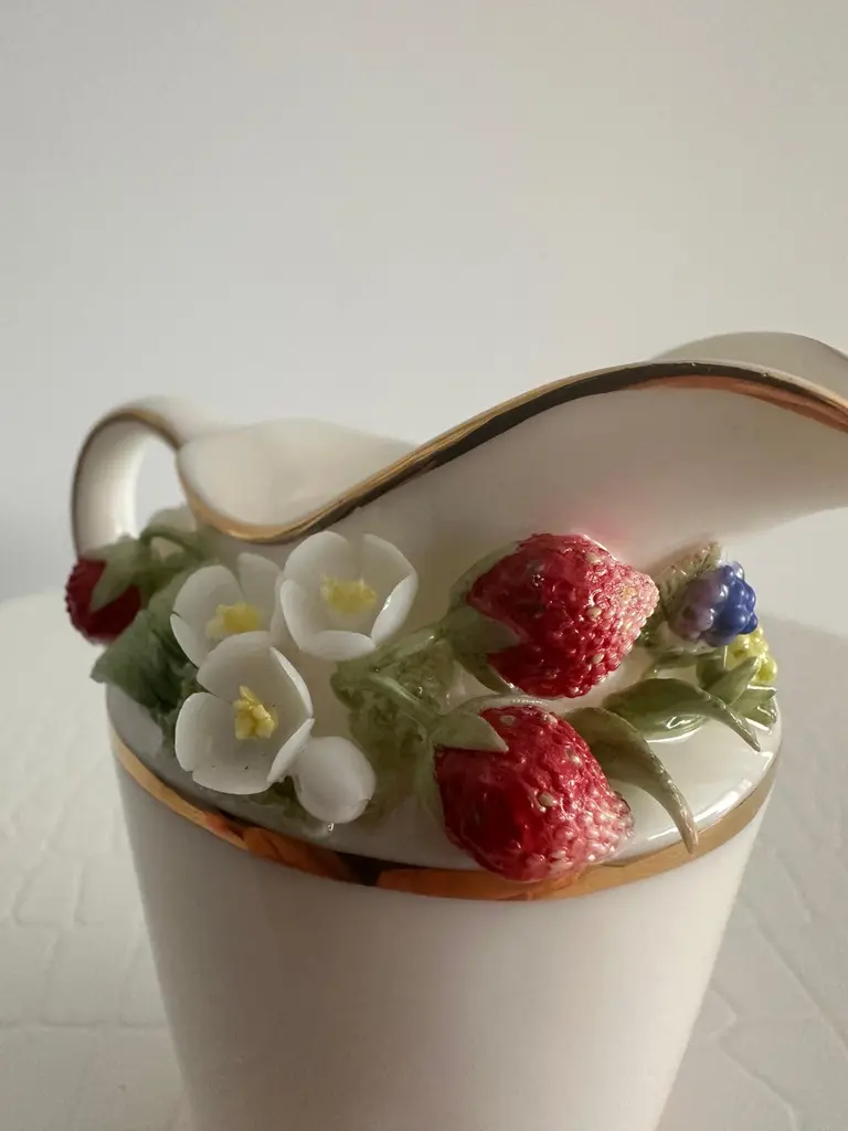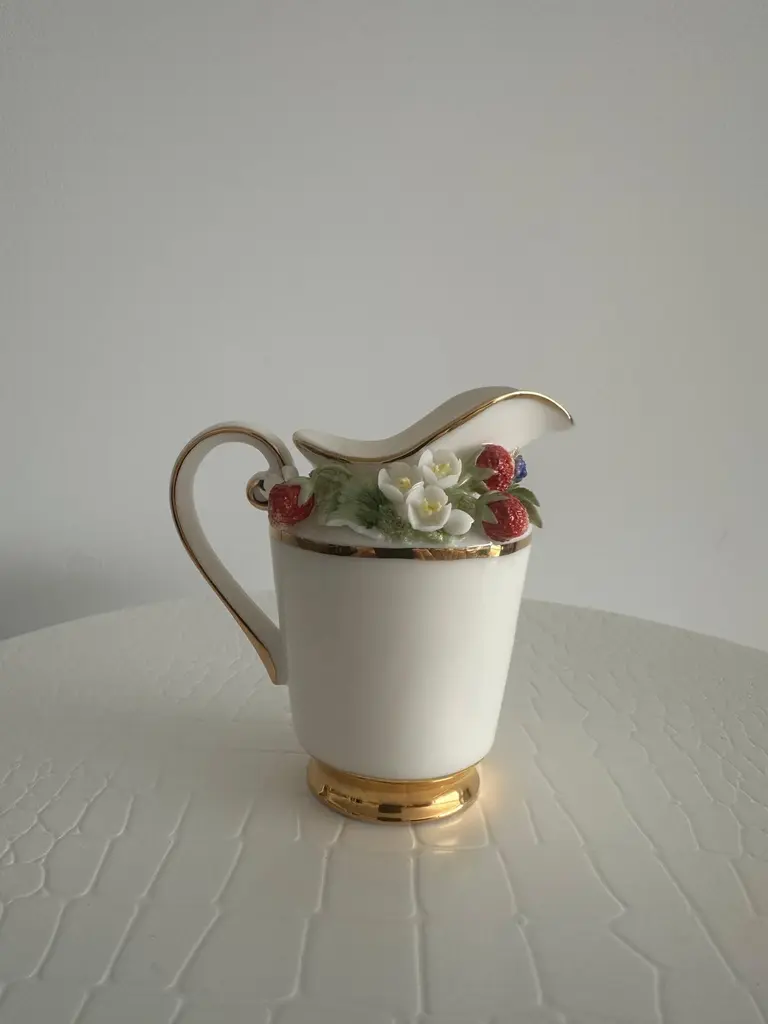 Handmade Relief Moulding Porcelain Decorative Wild Strawberries Design Milk JugThe three-dimensional design technique on porcelain, using relief moulding, involves creating a raised or sculpted design on a flat surface by adding or removing clay. This technique can be used to create decorative elements or artistic designs on porcelain pieces. There are various approaches, including applying clay to create raised areas (additive) or carving away portions to create depressions (subtractive). The artist creates a composition of their naturalistic flowers and strawberries, bringing nature's creations to life in porcelain. The coffee cup created in a romantic style represents a collector's and decorative class object, for those who collect unusual and rarely seen things. Made in Italy by a special bespoke order after Alexander's Collection original design.
