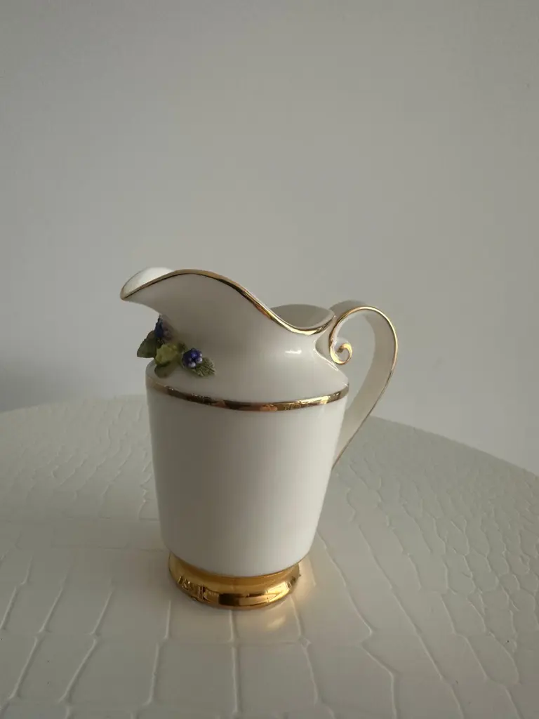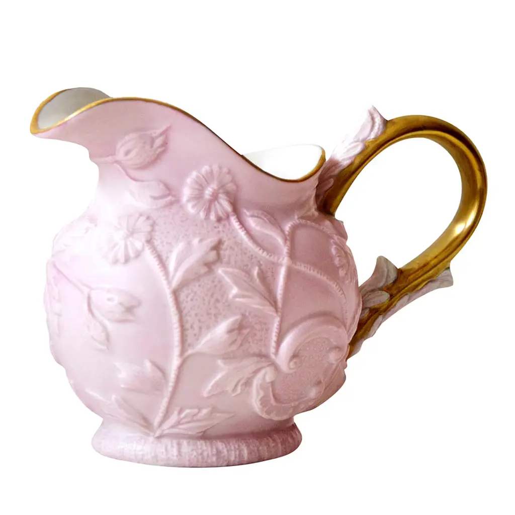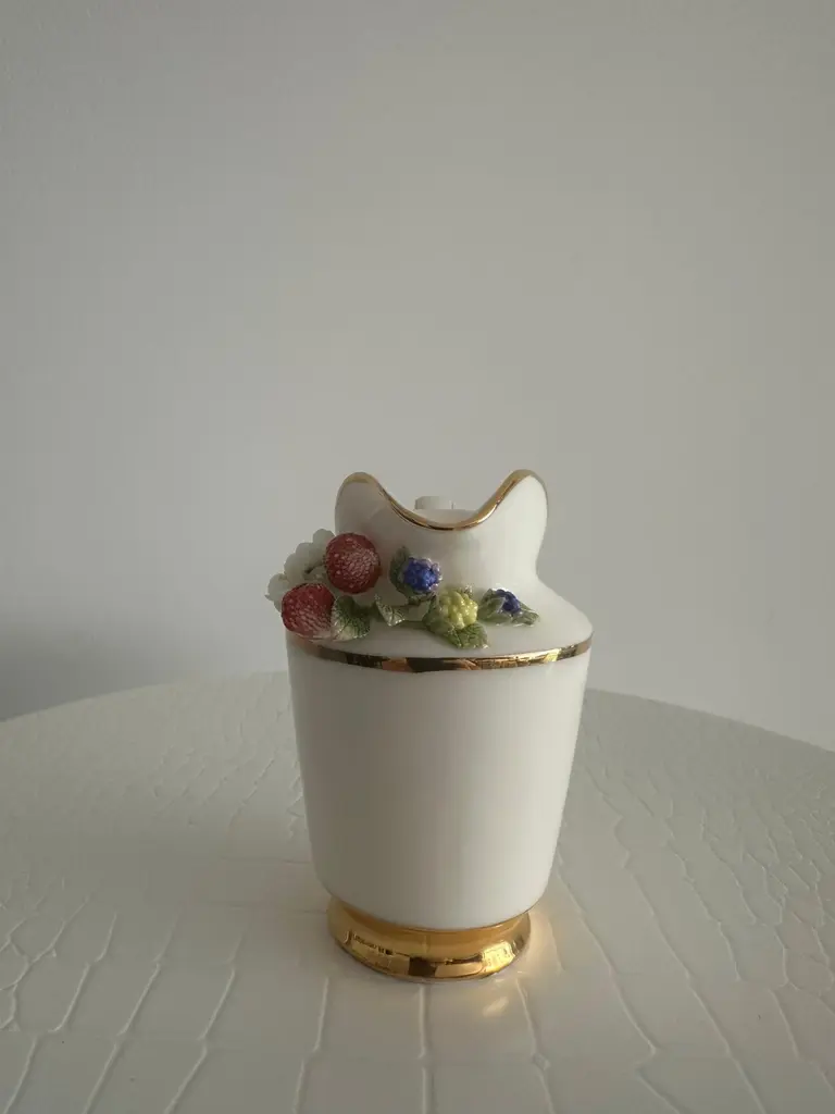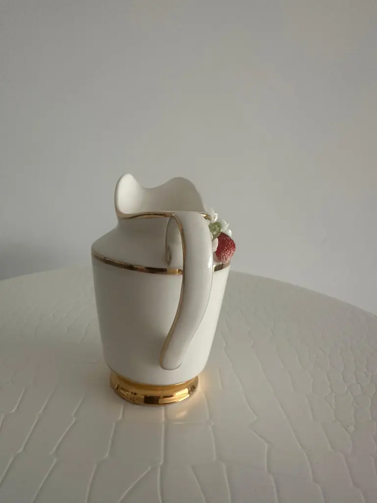 Handmade Relief Moulding Porcelain Decorative Wild Strawberries Design Milk JugThe three-dimensional design technique on porcelain, using relief moulding, involves creating a raised or sculpted design on a flat surface by adding or removing clay. This technique can be used to create decorative elements or artistic designs on porcelain pieces. There are various approaches, including applying clay to create raised areas (additive) or carving away portions to create depressions (subtractive). The artist creates a composition of their naturalistic flowers and strawberries, bringing nature's creations to life in porcelain. The coffee cup created in a romantic style represents a collector's and decorative class object, for those who collect unusual and rarely seen things. Made in Italy by a special bespoke order after Alexander's Collection original design.