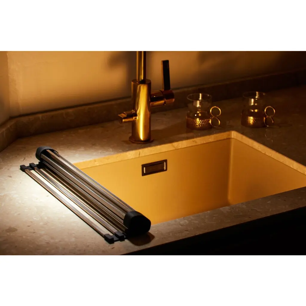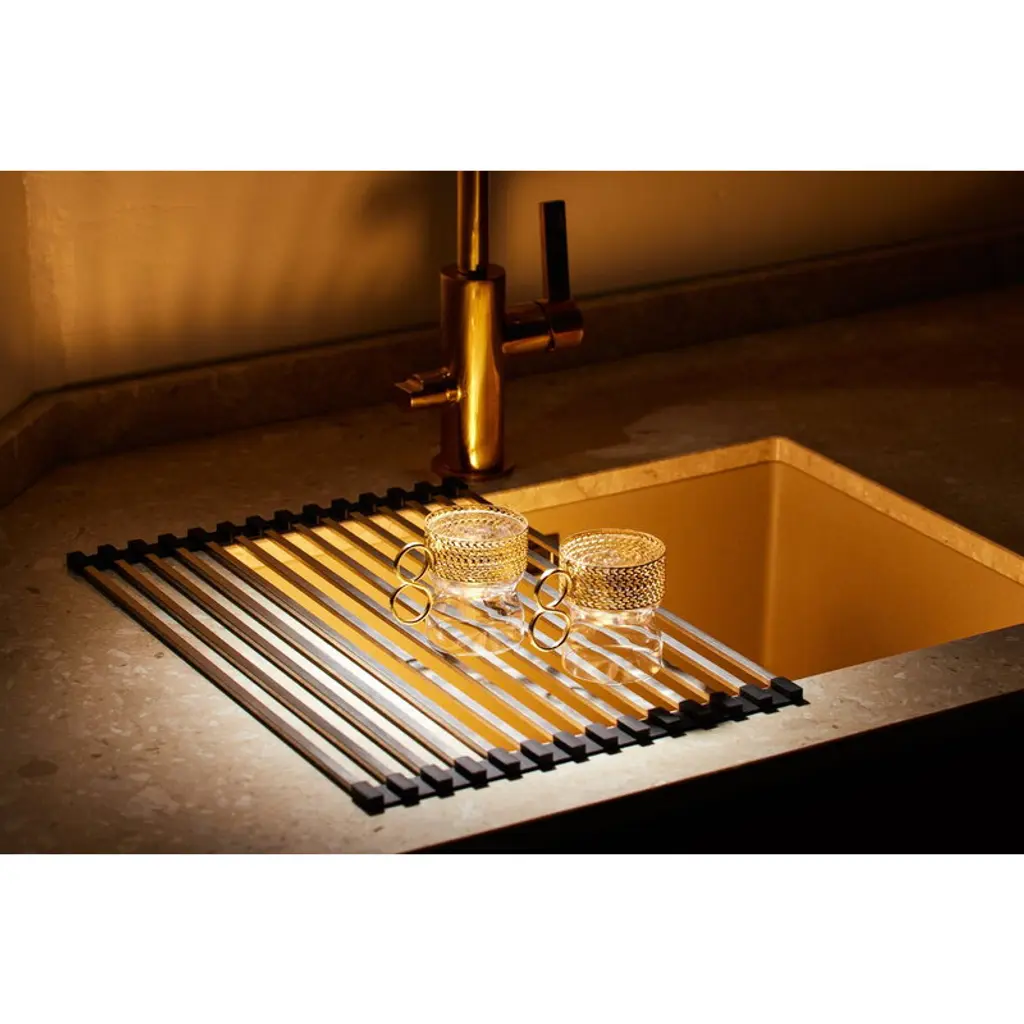 The Happy Sinks drying rack is a sleek multi-purpose rack, which can be used for drying dishes, draining freshly washed vegetables or placing a hot pot straight from the stove. The stainless steel rack has silicone ends that keep it firmly in place. The rack is easy to roll up and open whenever needed, and its simple, streamlined design will find its place in any kitchen. The Happy Sinks drying rack is suitable for sinks with a width of less than 18.11 x 0 in (46 x cm. cm).