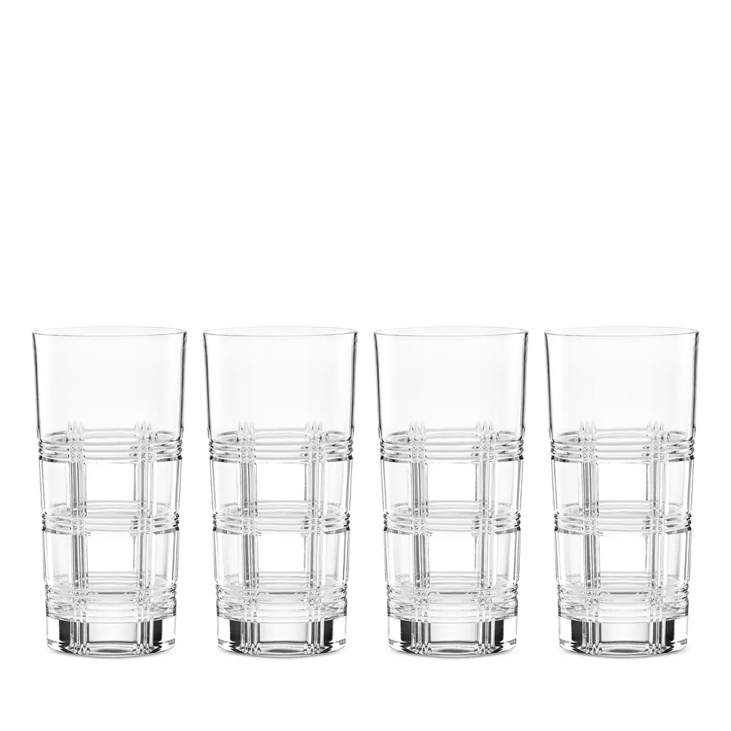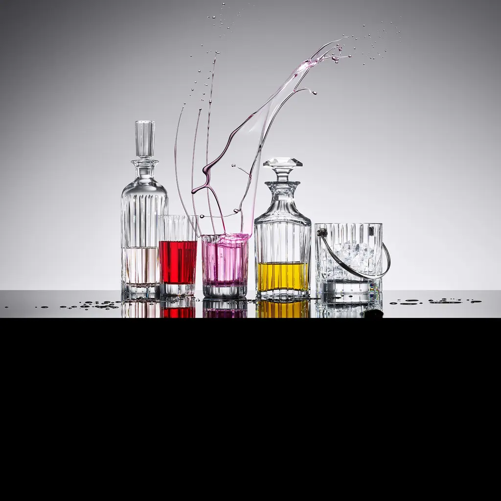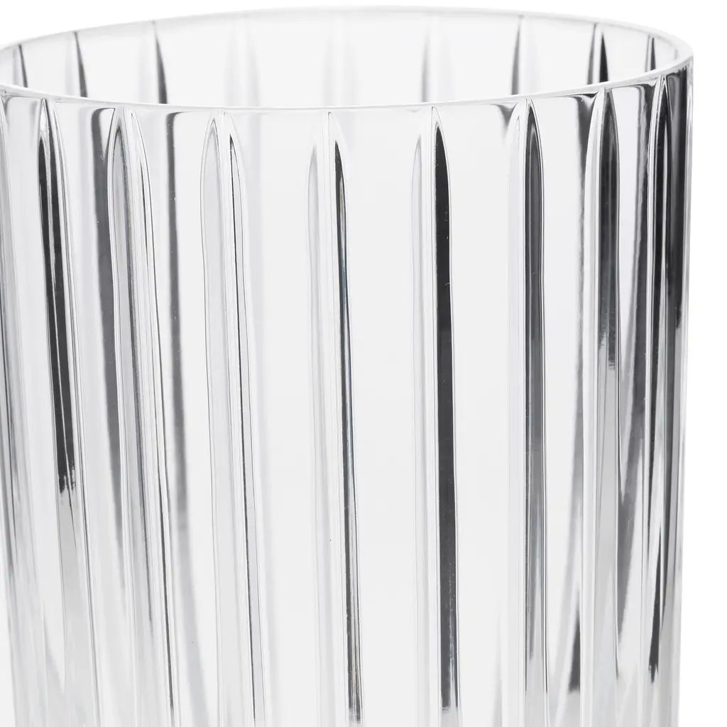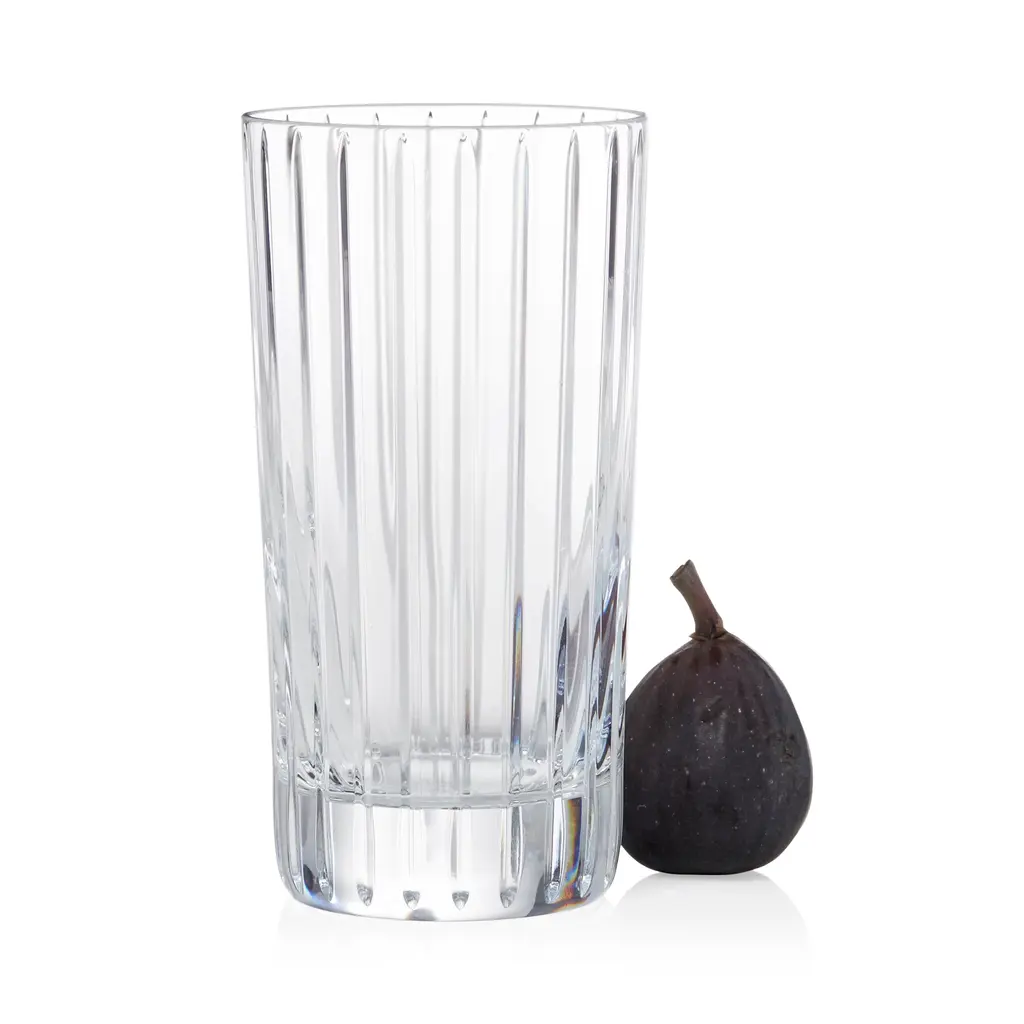 Consecutive parallel cuts travel cleanly along the Clear crystal grazing the highball glass from its lip all the way down to its thick base. The glass has a statuesque look, emphasized by the verticality of the lines, and the ridges bring a textural quality to the surface. It's a piece to admire as you sip your spirits and mixed drinks.