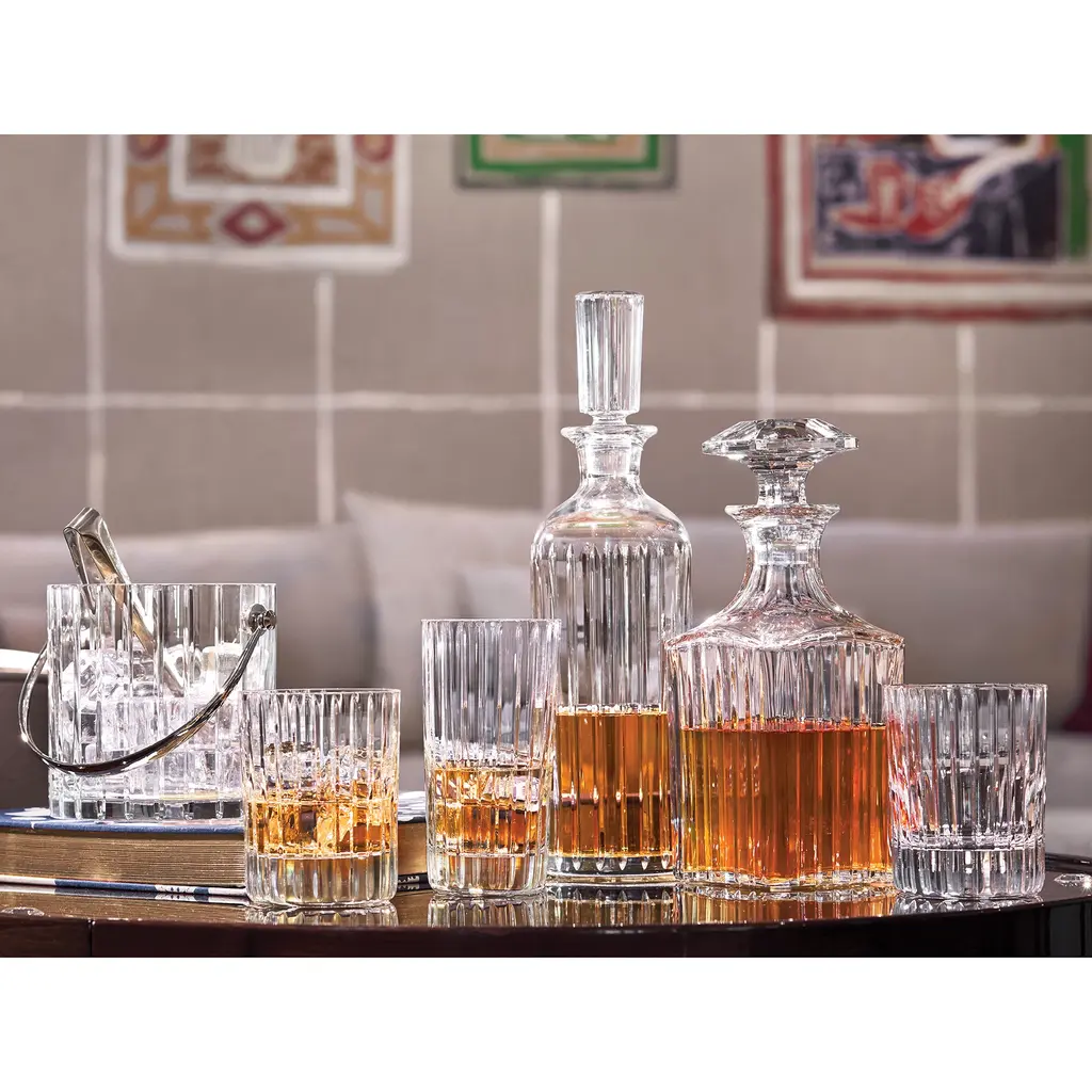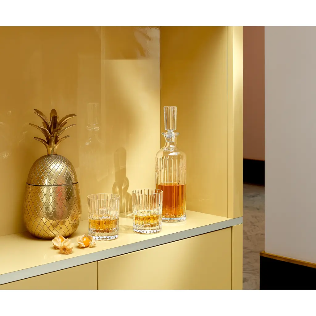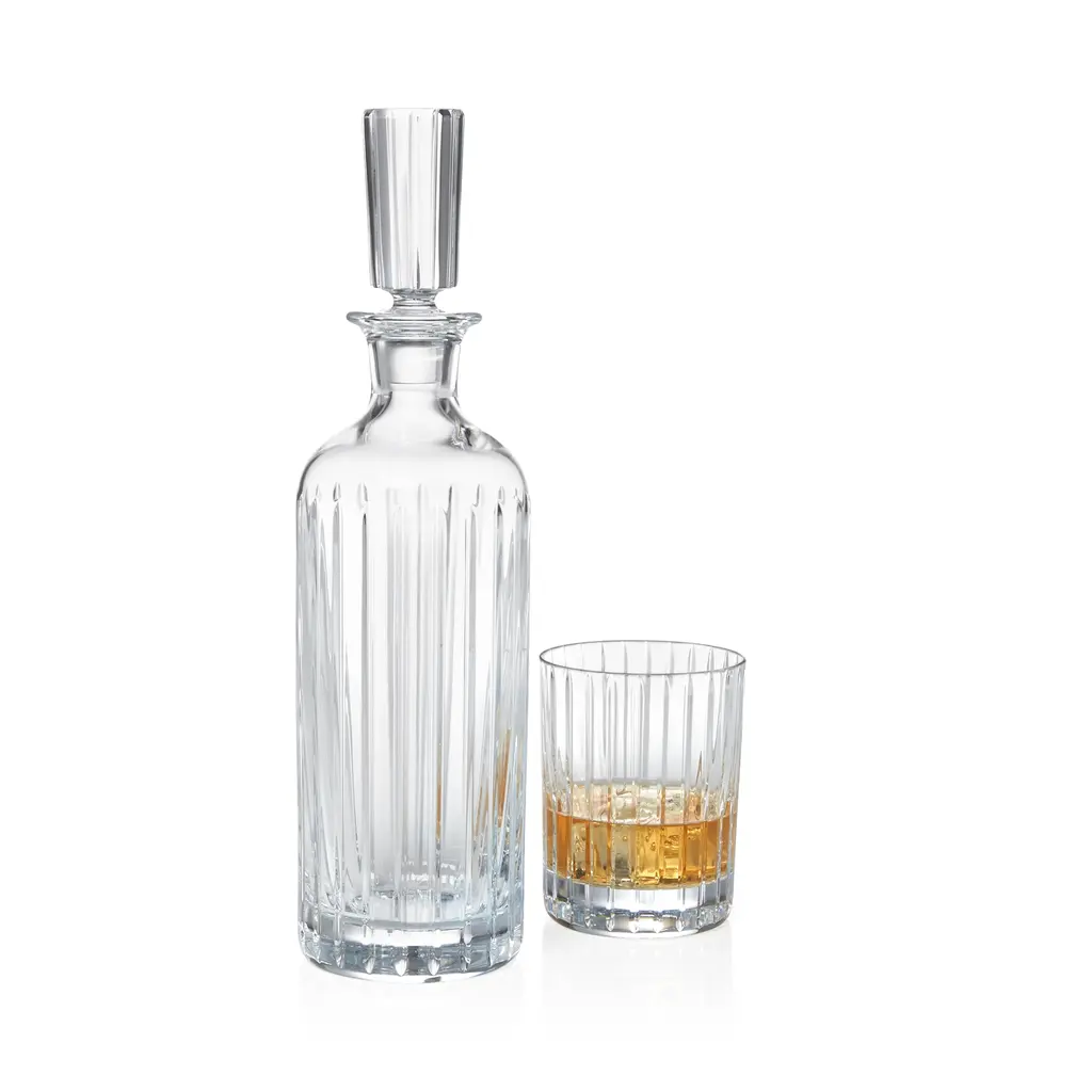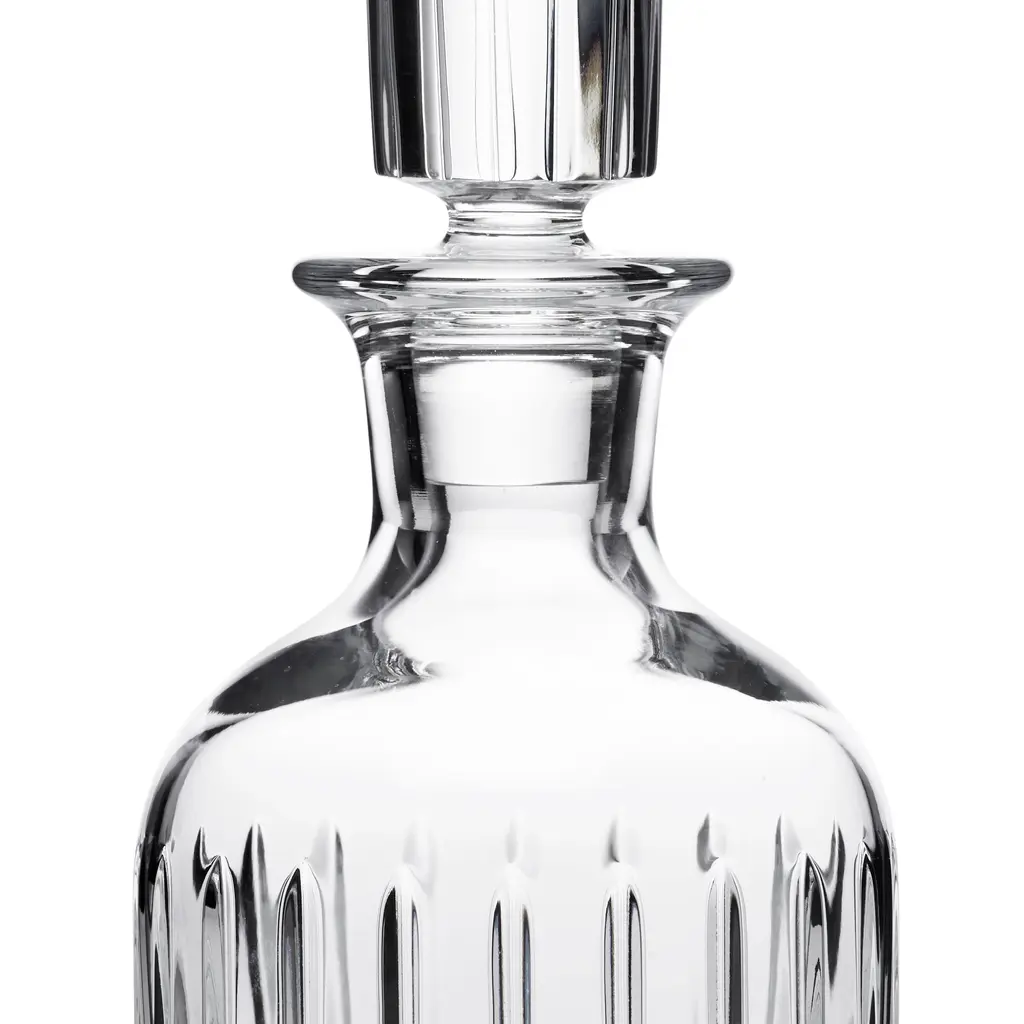 With a trim, streamlined silhouette, the Harmonie Round Whiskey Decanter features consecutive parallel lines along the form, subtly grazing the crystal bottle from its base to its shoulder. The lean stripes bring a textural quality to the surface, showcasing the three-dimensionality of the decanter and creating a visual depth to the whiskey within. The tall beveled stopper, which resembles a stately top hat, adds linear emphasis.