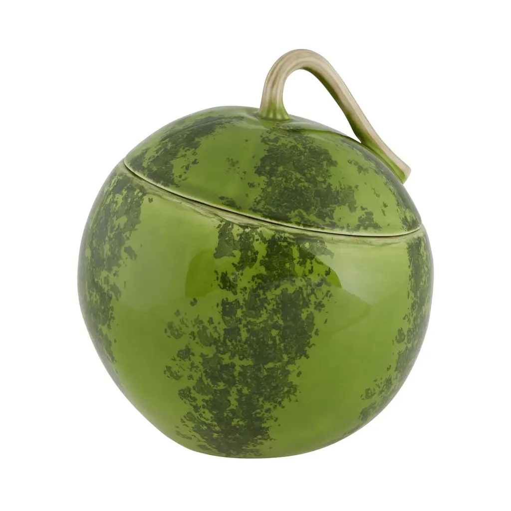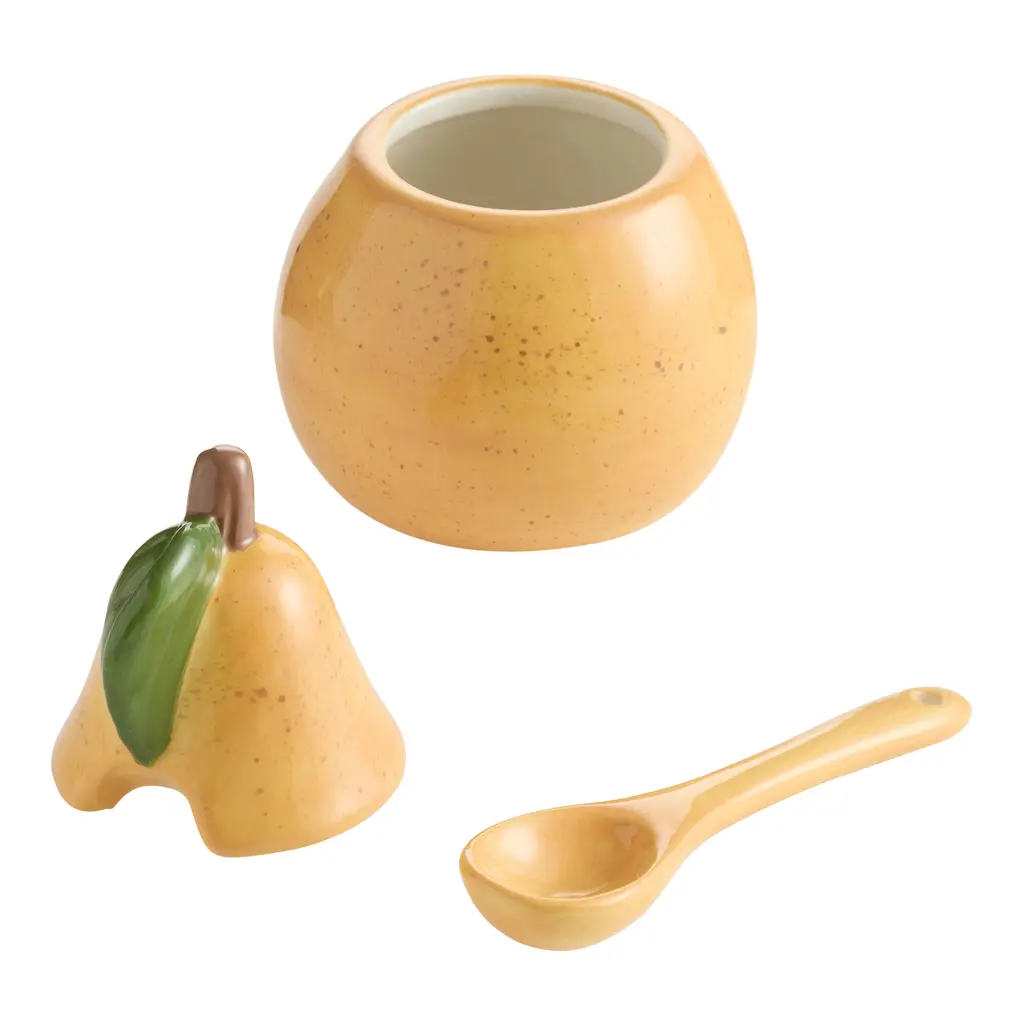 Complete with a serving spoon, our pear-shaped ceramic sugar bowl brings a handcrafted, autumnal vibe to your counter and table in sun-ripened harvest hues. Richly speckled and topped with a lid featuring an earthy brown stem and textural green leaf, its fine detailing creates impressive depth in a petite size. Storing and serving sugar with its matching spoon, this affordable artisan gift celebrates the rustic beauty of the fall countryside.