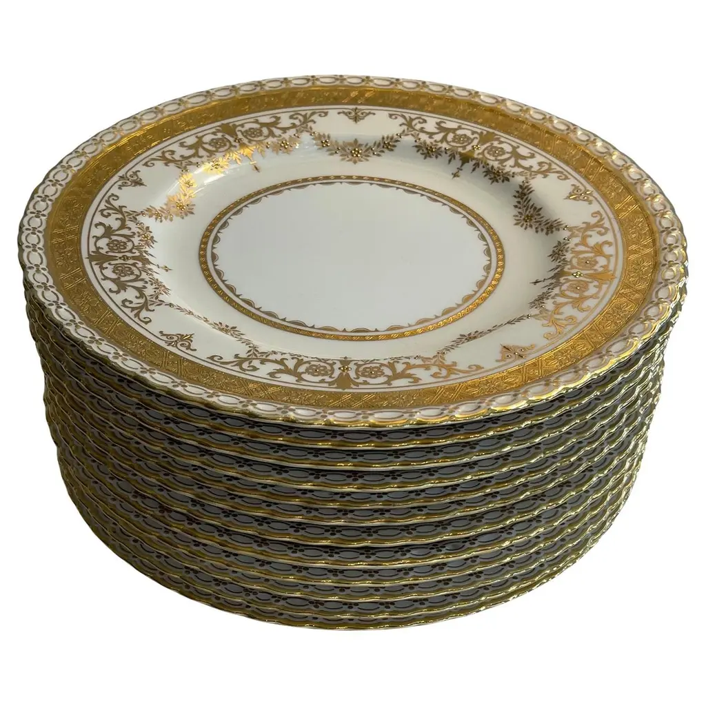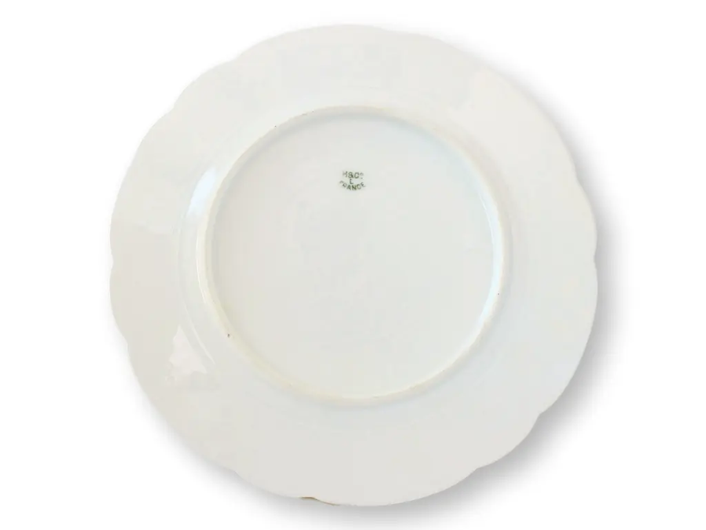 This exquisite set of 10 Haviland Limoges luncheon plates features delicate hand-painted floral motifs in soft pastel colors, highlighted by intricate gilt accents along the scalloped edges. The unique and unusual design showcases the elegance and artistry for which Haviland is renowned. Perfect for special occasions or as a cherished addition to your collection, these plates bring timeless charm and sophistication to any table setting. Marked on back.