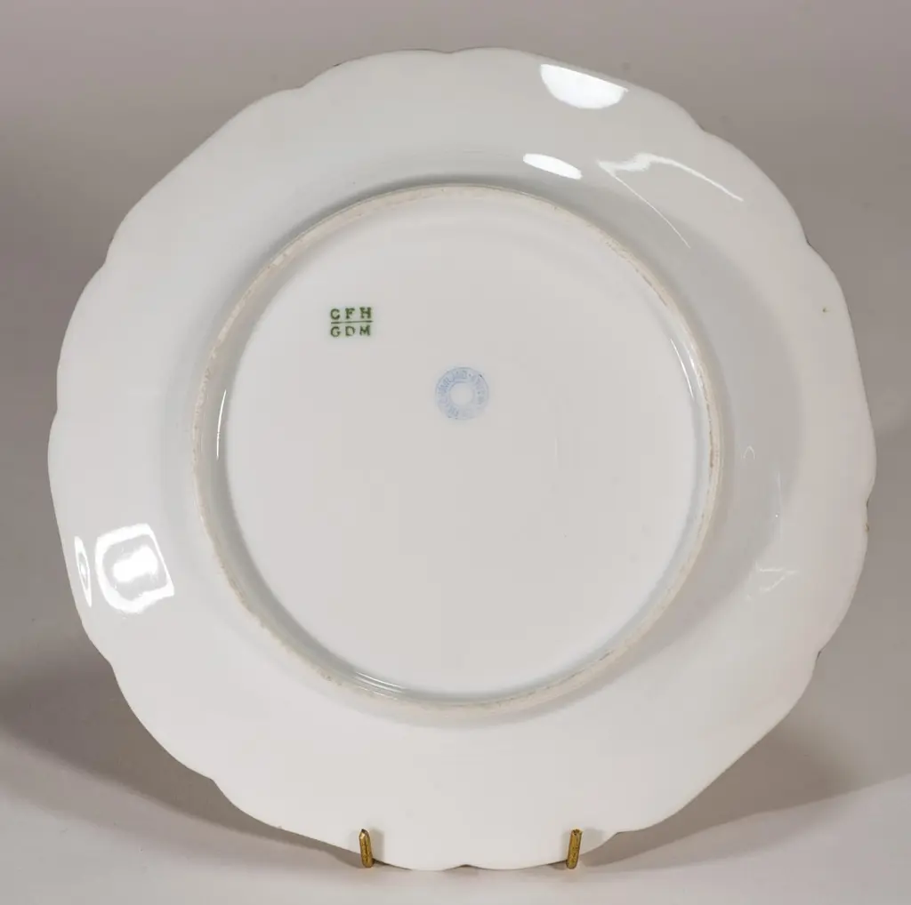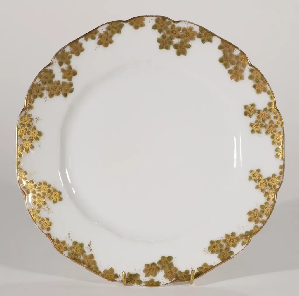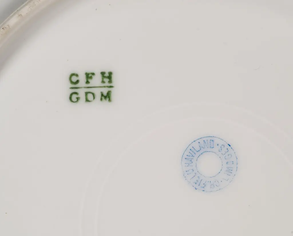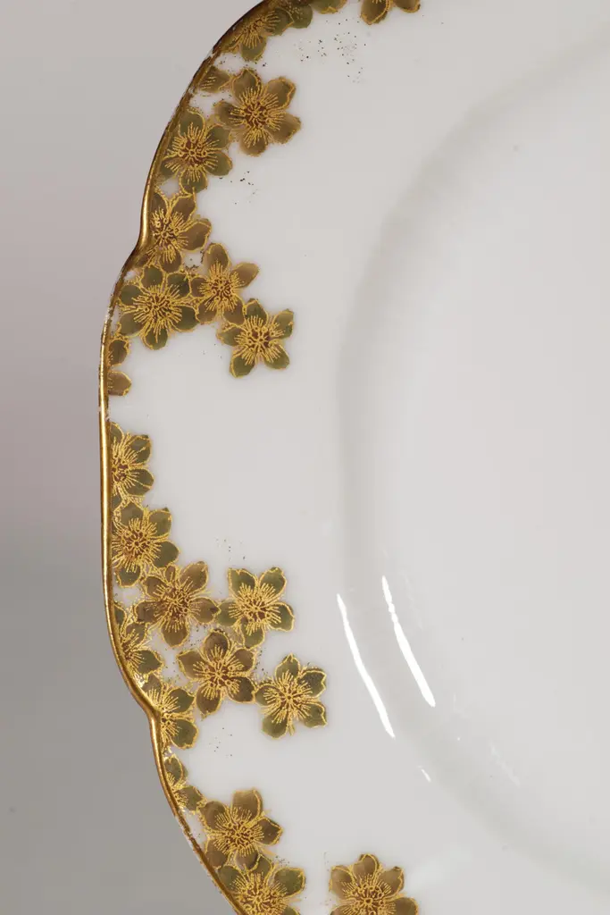 Set of 6 antique luncheon or salad plates features an abstract flower decor in gold and moss green colors. The decor appears to be a variation of the iconic Dammouse pattern that was created by Edouard Dammouse, noted painter employed by Charles Haviland between 1876 and 1885 in Auteuil studio, as a multifloral pattern in 12 units, inspired by Japanese drawings and contemporaneous Japanism style. Delicate flower garlands complement lightly textured plate, guiding the eye along the softly shaped rim without overpowering the piece. One can note Art Deco and Arts and Crafts influences in this version of the pattern.The pattern on the plates is more subdued than the classic Dammouse pattern, but shares the size and the style of the flower elements, as well as the color palette; it is also less common than Dammouse, which makes it quite rare. We saw another variation of the pattern created by Haviland specifically for Wright Tyndale & Van Roden in Philadelphia, with marks dating to 1875-1882, done in a different colorway with flower decors organized in sprays instead of floating in space in Ukiyo-e style, like in this set. The plates are marked with underglaze green factory mark "CFH/CDM", dating back to 1882-1891, and blue overglaze decorator donut mark "C.H. Field Haviland Limoges", that was in use from 1862 to present. Overall, the marks date the plates to 1882-1891. This service does not seem to be created for a specific distributor or a store.The plates are in good antique condition; at the time of the listing, we're offering 2 sets of 6 plates each separately for your convenience.