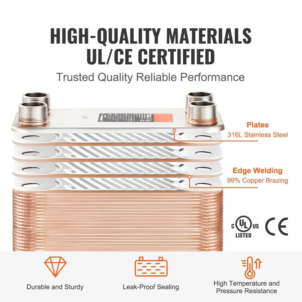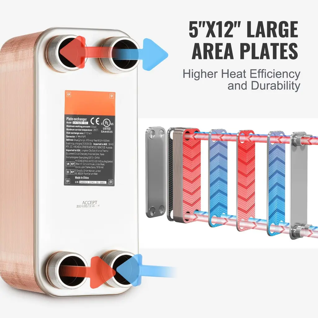 High-Quality Materials: Made of 316L stainless steel with 99% copper brazing at edges and contact points, forming a robust and leak-resistant unit that withstands high pressure and temperature. CE certified for reliable quality. Efficient Heat Transfer: The high-conductivity stainless steel plates feature an asymmetrical herringbone pattern, creating intense pressure turbulence for efficient heating/cooling. With up to 99% heat efficiency, it generates 780-1080K BTU per hour (for 80 Plates option) / 500-660K BTU per hour (for 50 Plates option) / 260-360K BTU per hour (for 30 Plates option) , saving pump power and electricity, reducing overall application costs. Large Heat Exchange Area: The heat exchanger features 5"x12" plates with up to 80 plates / 50 plates / 30 plates, providing excellent heat transfer performance for maximum efficiency. Suitable for operating temperatures from -292℉ to 392℉. Tight and Leak-Proof: To eliminate the possibility of micro-leaks, the heat exchanger uses high-pressure vacuum brazing and undergoes helium leak testing, ensuring long life and high reliability. Stable Installation: Includes two stainless steel brackets made of 304 stainless steel, offering excellent rust resistance and stability for easy and secure mounting of the heat exchanger. Package Content Heat Exchanger x 1 Mounting Brackets x 2