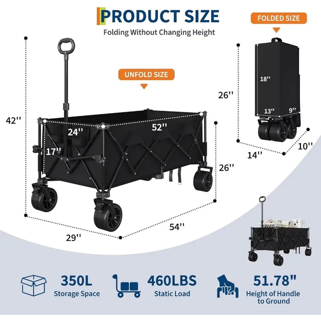 Heavy Duty Utility Beach Wagon Cart, Collapsible Wagon Beach With All Terrain Wheels, Extra Long Wagoncart Foldable With Cup Holders For Sand Black