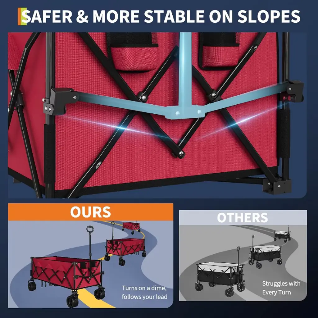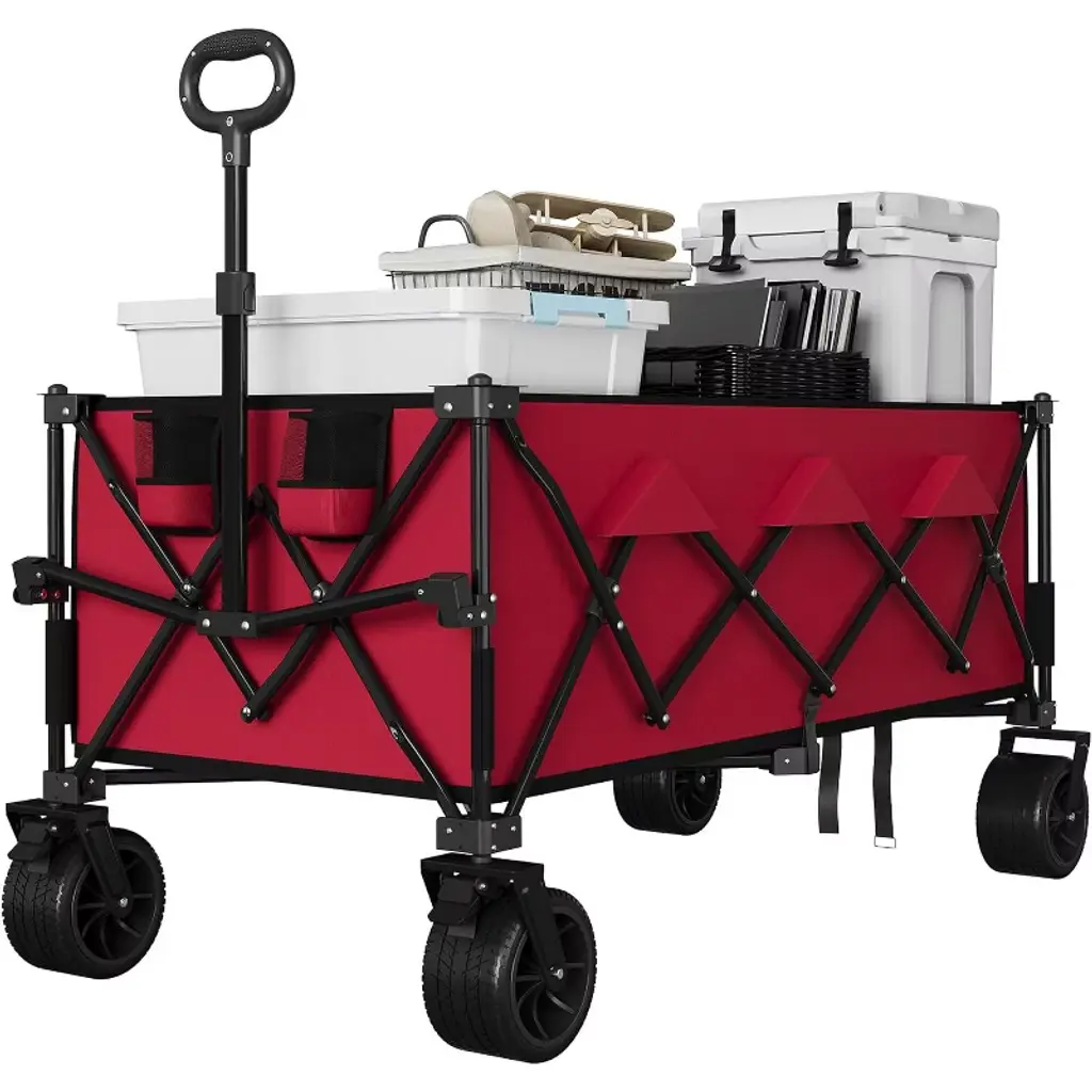 Heavy Duty Utility Beach Wagon Cart, Collapsible Wagon Beach With All Terrain Wheels, Extra Long Wagoncart Foldable With Cup Holders For Sand Red