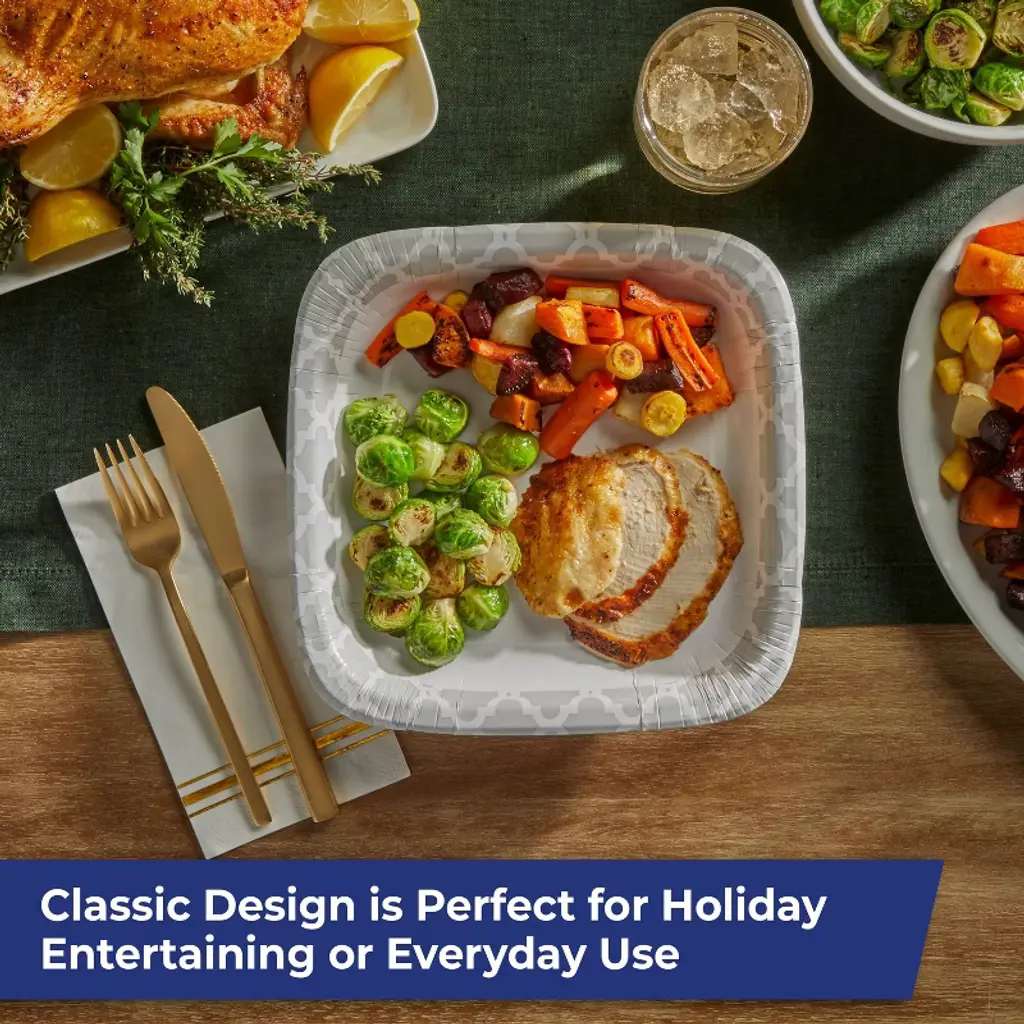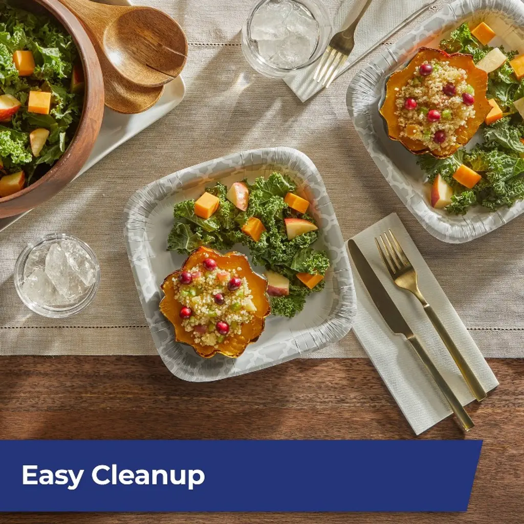 Hefty Extra Deep 8.6 Inch Paper Plates allow you to hold more without worrying about spilling. These square paper plates are 30% deeper*, holding larger helpings or allowing you to separate foods. These large paper plates are microwave-safe & feature a white-and-gray pattern that suits any occasion & is great for everyday meals. A soak-resistant layer prevents the plates from leaking, & they are BPI certified commercially compostable**. *30% deeper than the leading store brand plate. **Commercially compostable only. Limited facilities may exist in your area. Not suitable for home composting.