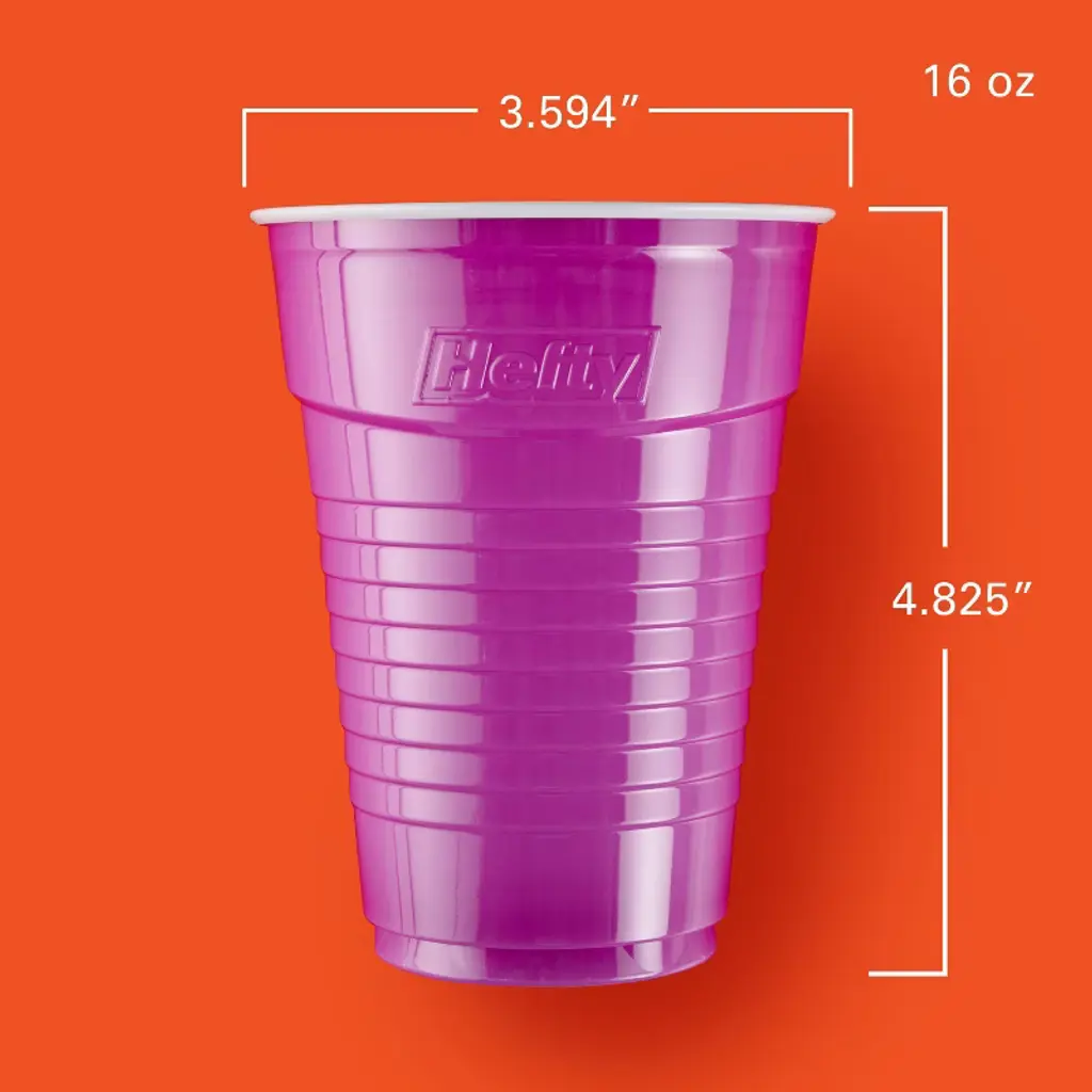 Hefty Everyday Plastic Party Cups are great for any occasion. Save time on clean-up at your next party or everyday meal with these 16-ounce plastic party cups. Enjoy the party without worrying about dishes or broken glassware - simply toss these cups when you're finished. The #1 Branded Party Cup in America is available in a mix of four vibrant colors: amethyst, neptune blue, paprika, and apple green. Serve cold drinks at your next holiday dinner, birthday party, and more with these easy-to-grip cups. Made in the USA.