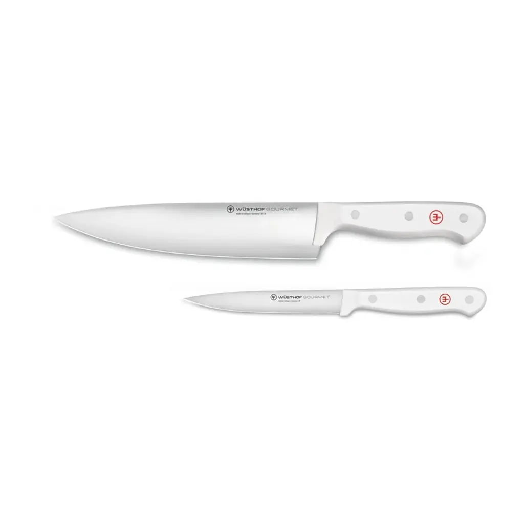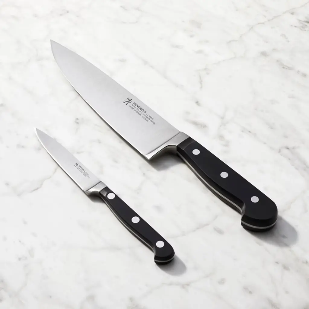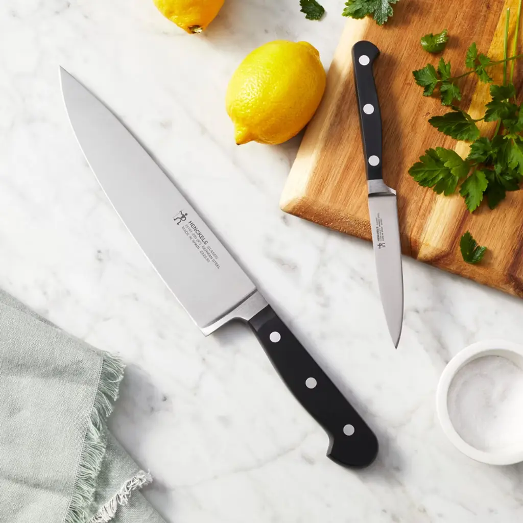 Meal prep is easy with the HENCKELS Classic 2-piece Must have Knife Set. Honed for long-lasting sharpness, the fine-edge blades are perfect for precision cuts. Effortlessly chop herbs with the 8-inch chef's knife, and peel apples with the 4-inch paring knife.High-quality German stainless steel strengthens this durable, Spanish-made knife. With a seamless transition from blade to handle, Classic knives' fully forged construction provides balance as the traditional triple-rivet handles encourage tireless cutting. These satin-finished blades are conveniently dishwasher safe.