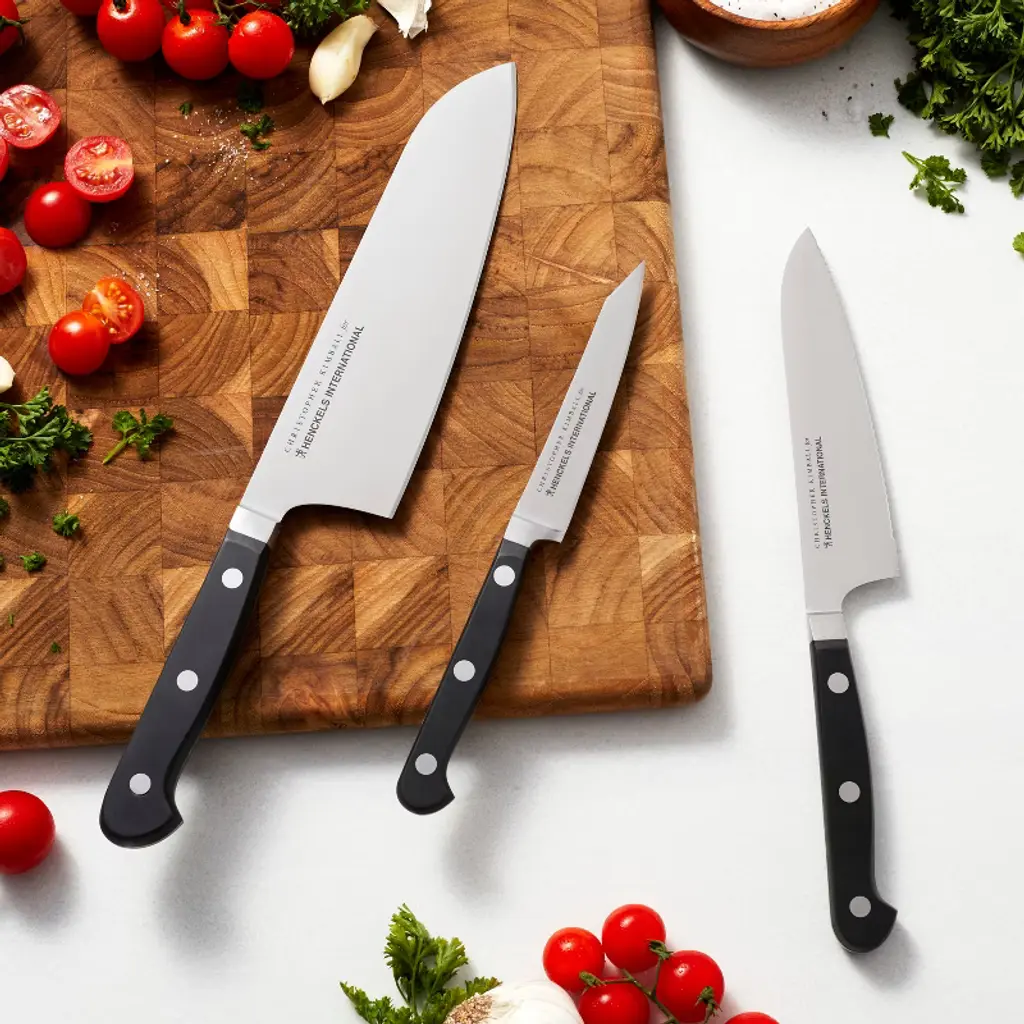 Christopher Kimball has been teaching cooking for three decades on national television and radio, as well as in award-winning cookbooks, magazines, online, and at live events. Founder of Christopher Kimball's Milk Street Kitchen and a friend of the real home cook, Mr. Kimball is fascinated by the tools of the trade including what works and what doesn't. Now he is putting that experience to good use in designing kitchen tools for how we really cook today.Experience confidence with each cut. The Henckels International CLASSIC Christopher Kimball Edition 3-pc Collector's Set boasts precision blades that are designed for long-lasting sharpness. This set includes a 4" paring knife, 5.5" serrated utility knife, and a 7" cook's knife. Everything you need for day-to-day kitchen tasks.With a seamless transition from blade to handle, the knives' fully forged construction provides balance as the traditional triple-rivet handles encourage tireless cutting.Henckels International makes essential kitchen tools every home chef needs. From steak knives to spatulas, every product boasts high quality at an exceptional value. Created in 1895 by Zwilling J.A. Henckels, this value-driven brand guarantees the same durability, design and ease of use for which the global company is known. Equip your kitchen with expertise with Henckels International.
