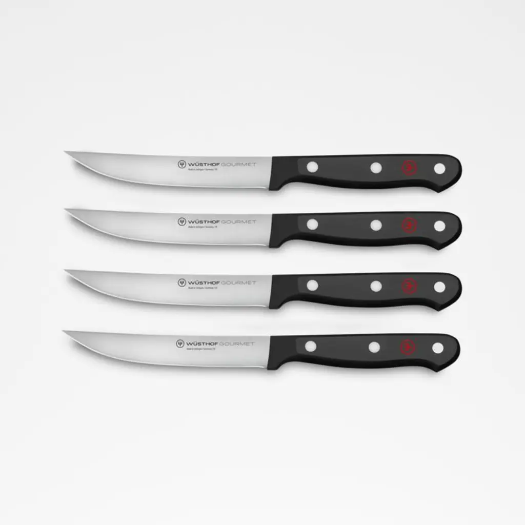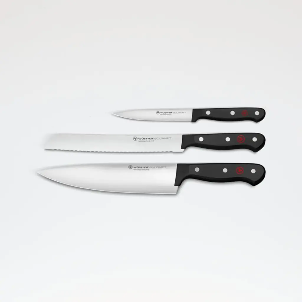 This 3-piece knife set features three of the most important knives in any kitchen. The paring knife for smaller scale jobs, like peeling vegetables and segmenting citrus, the serrated utility knife for cleaning, peeling, and slicing small fruits and vegetables, and the all-rounder chef’s knife for chopping herbs, slicing meat, dicing onions, and much more.Fabricated from durable, high-quality stainless steel, Solution’s single-piece, stamped blade construction is lighter than forged knives. Along with the full tang, this encourages maximum maneuverability. The ergonomic, traditional triple-rivet handles are curved for comfort and balance for fatigue-free cutting.
