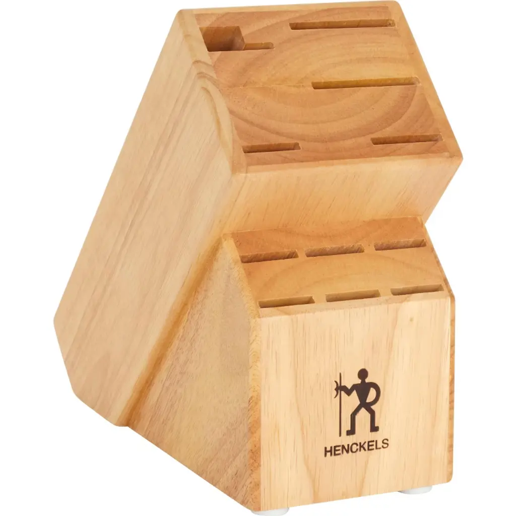The Henckels International Statement 12-pc Knife Block Set is stocked with tools to easily tackle your kitchen tasks. Honed for long-lasting sharpness, the fine-edge blades boast precision cutting. The all-rounder 8" Chef's Knife is perfect for chopping herbs and dicing onions while the 8" Bread Knife cleanly slices through crusty sourdough. Efficiently mince garlic with the 7" Hollow Edge Santoku, whose blade has small indentations, aka grantons, which prevent food from sticking while cutting.Fabricated from durable, high-quality stainless steel, Statement's single-piece, stamped blade construction is lighter than forged knives. Along with the full tang, this encourages maximum maneuverability. The traditional triple-rivet handles are curved for comfort and balance while the stainless steel endcap adds aesthetic appeal to your block display. Each time you cook, you will want to reach for this useful knife set.Henckels International makes essential kitchen tools every home chef needs. From steak knives to spatulas, each product boasts high quality at an exceptional value. Created in 1895 by Zwilling J.A. Henckels, this value-driven brand guarantees the same durability, design and ease of use for which the global company is known. Equip your kitchen with expertise with Henckels International.