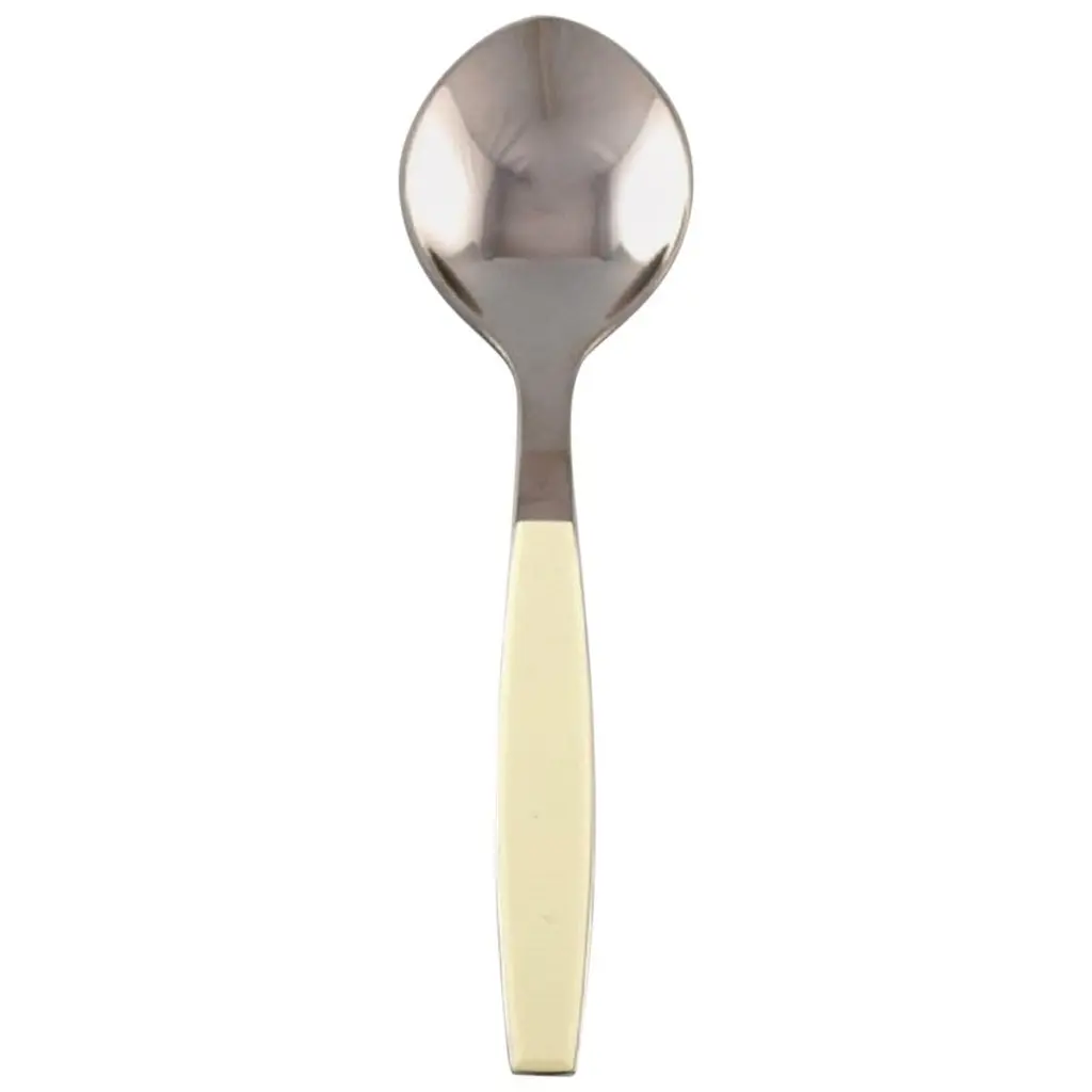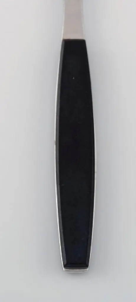 Henning Koppel for Georg Jensen. Strata bouillon spoon in stainless steel and black plastic, 1960s-1970s. 8-pieces in stock.Measures: Length 15.7 cm.In very good condition.Stamped.