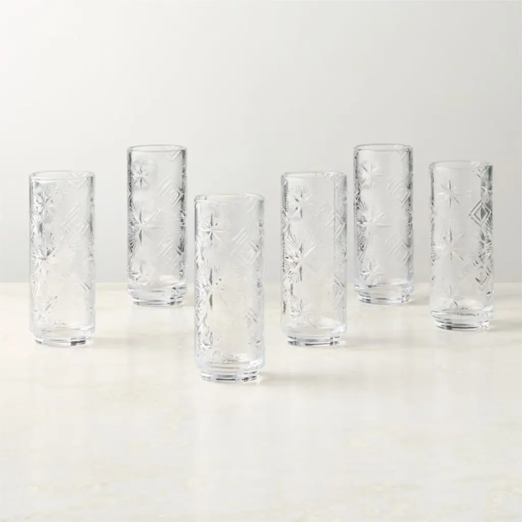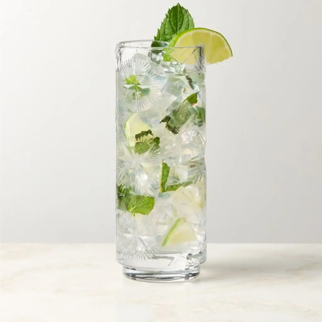 Perfect for elegant entertaining, pressed glass highballs make every sip stylish. Featuring an Art Nouveau-inspired design by award-winning Australian designer Silvana Azzi Heras of House of Heras, each piece is crafted from molten glass that is pressed into a mold to create the intricate star pattern. Pair with our Herald double old-fashioned glasses for a coordinated cocktail hour. CB2 exclusive.
