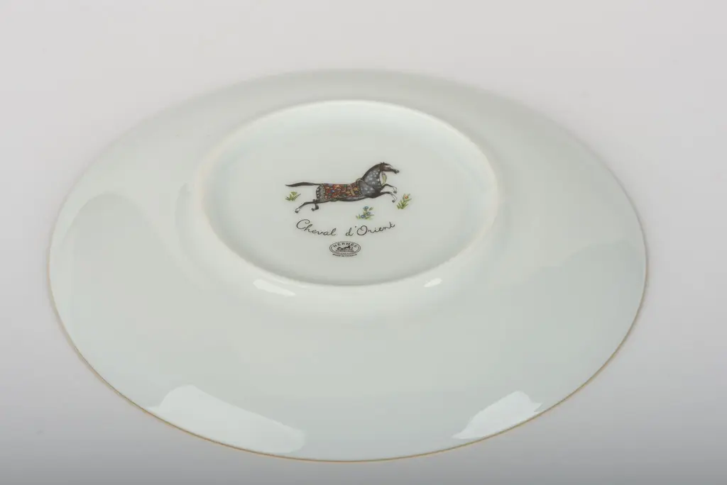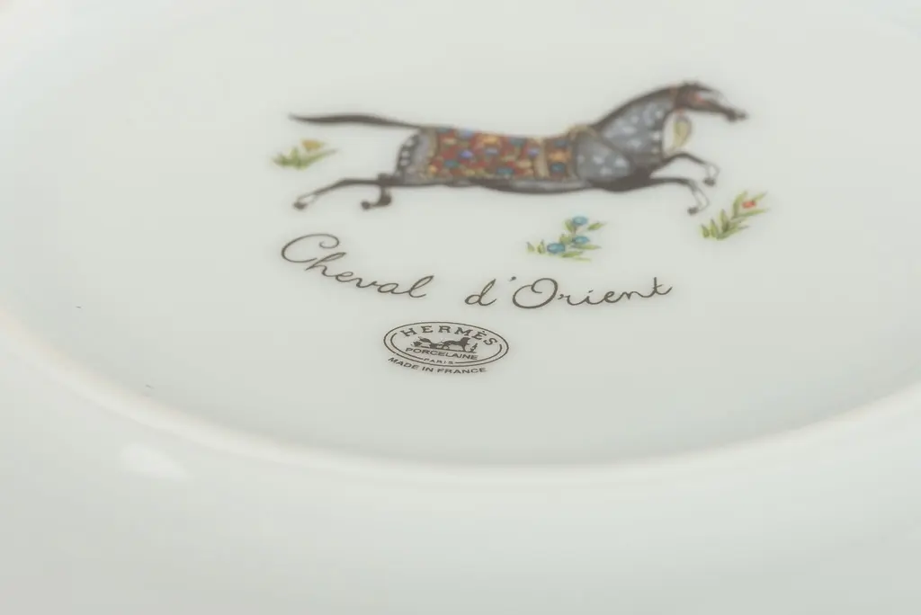 Set of two Hermès Limoges porcelain dessert dishes in the Chevaux d'Orient pattern. Original box included. Maker's mark on undersides.