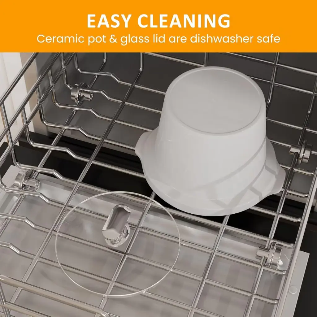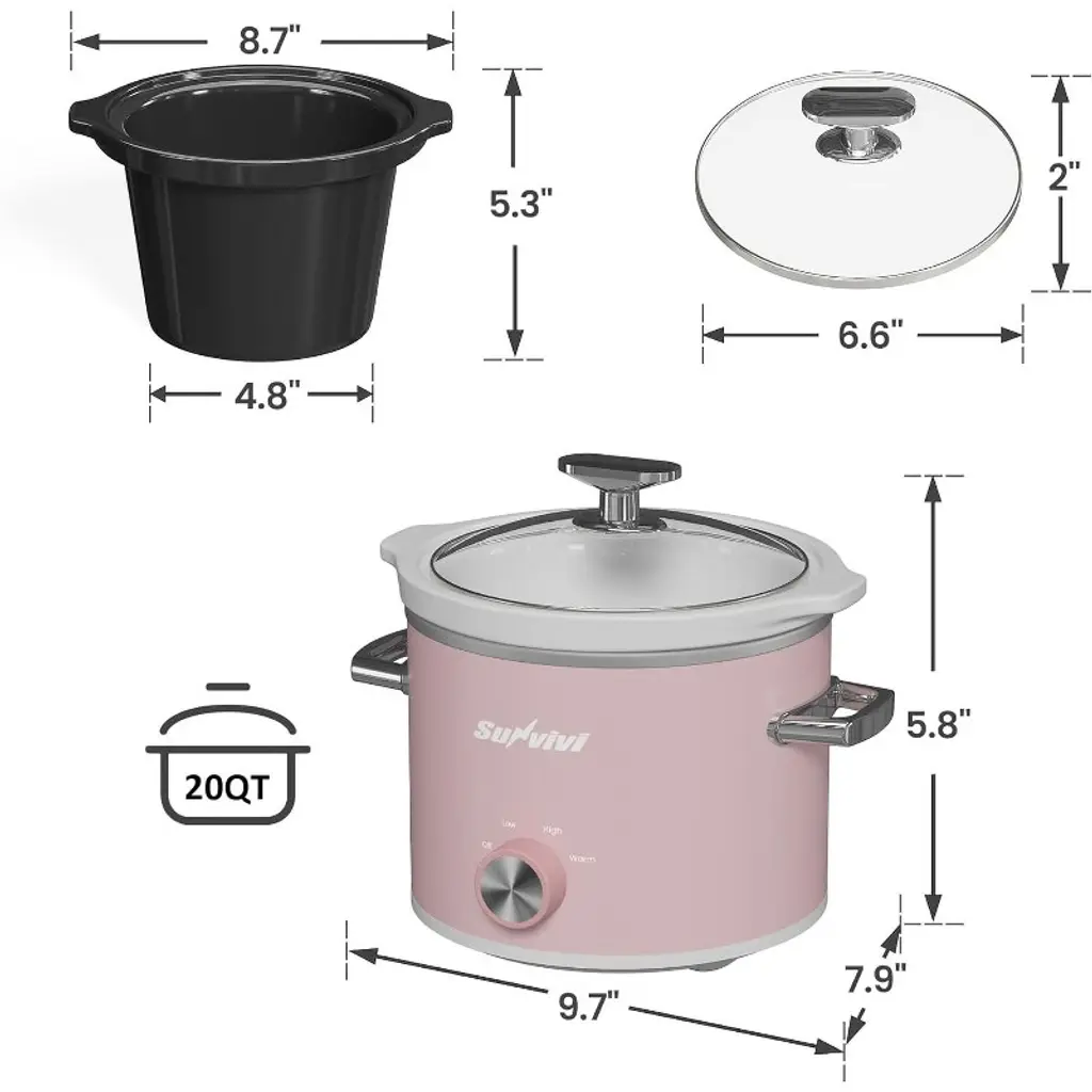 Introducing our 2QT slow cooker, ideal for singles and small families. With 3 heating settings—Low, High, and Keep Warm—you can easily simmer stews, tenderize meats, or keep dishes warm. Its compact design maximizes kitchen space while ensuring easy storage. The stylish wood grain handle and knob provide heat insulation, while anti-slip feet enhance stability. Built to last, it features a galvanized handle and a ceramic inner pot for even heat distribution, enhancing flavors and textures. Plus, cleanup is effortless with the dishwasher-safe removable pot and glass lid, letting you enjoy your meals without the cleanup hassle. Specification Product Name: 2 Quart Slow Cooker Color: Grey Pot Material: Ceramic Lid Material: Glass Dimensions: 10" L x 8" W x 8" H Capacity: 2 QT Voltage: 120V Frequency: 60Hz Power: High: 100W, Low: 70W, Warm: 30W