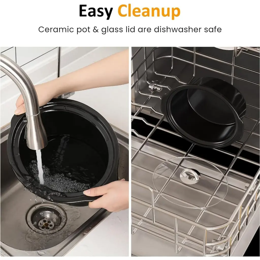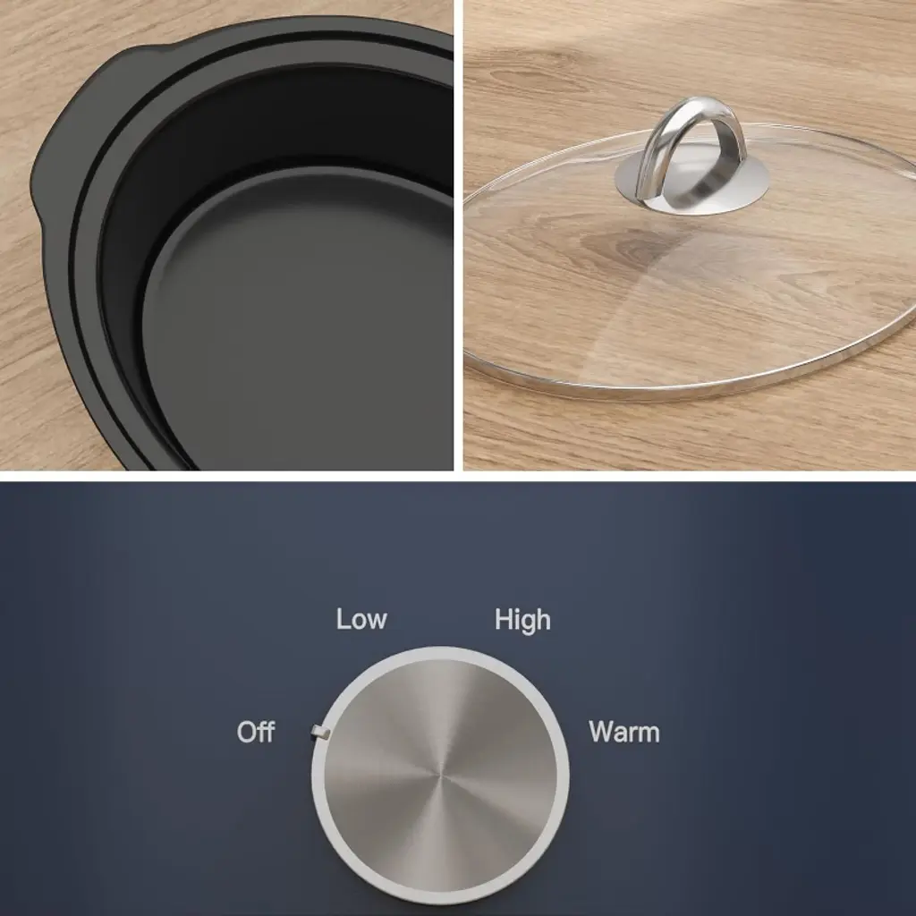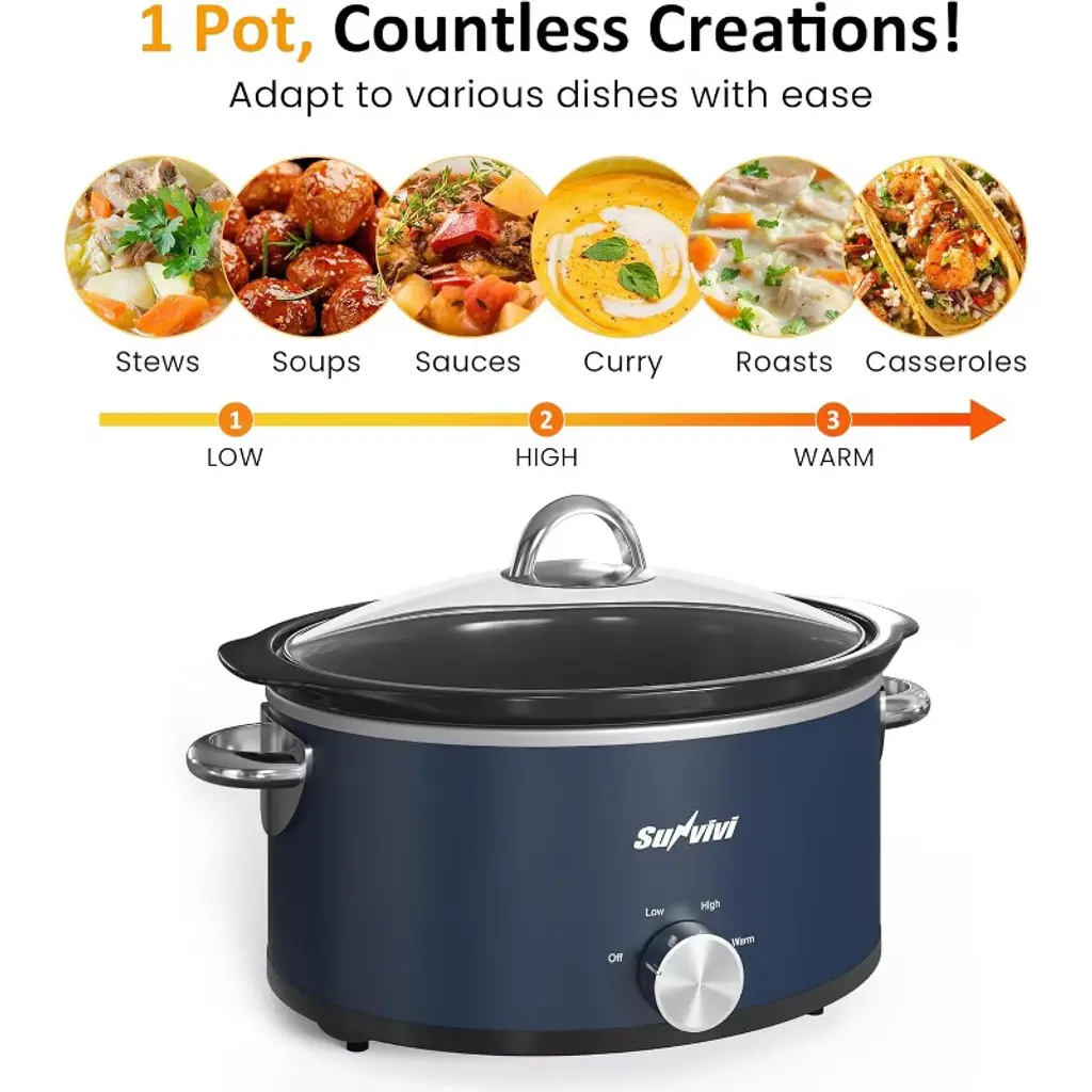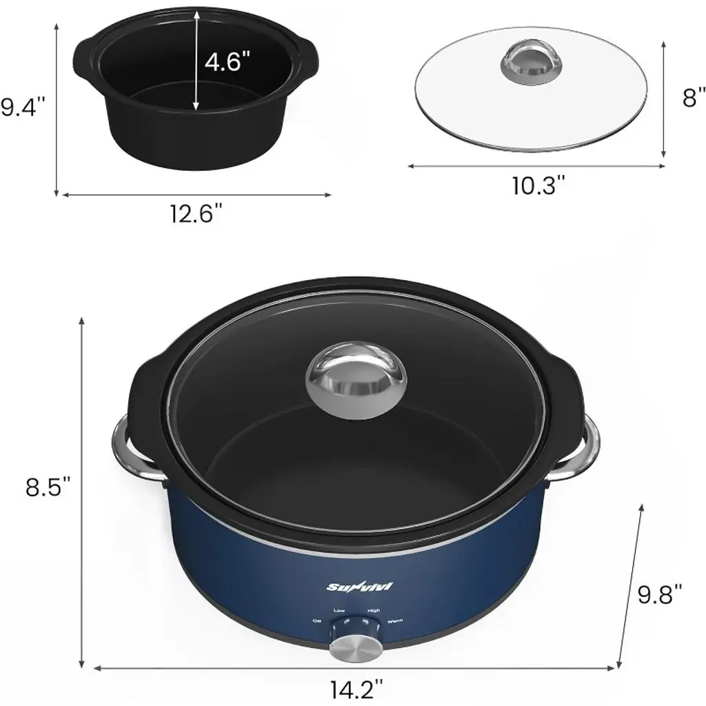 This 3 qt slow cooker is perfect for small families or individuals, offering precise control with its low, warm, and high settings. Whether you're gently simmering hearty soups and savory stews on a low setting, maintaining the perfect warmth for serving your favorite dishes, or searing meats to perfection at higher temperatures, the versatility of this mini slow cooker knows no bounds. It effortlessly accommodates a variety of cooking tasks, ensuring each meal is prepared with precision and care. Just simply add your ingredients, select the desired temperature setting, and let the cooker do the rest. Experience the culinary excellence of the small crock pot, making meal prep a breeze and every dish a masterpiece. Specification Product Name: 3 QT Slow Cooker Color: Blue Material: Stainless Steel, Borosilicate Glass, Ceramic Dimensions: 14''L X 9.44''W X 8.2''H Capacity: 3 QT Voltage: 120V Frequency: 60Hz Power: High: 170W, Low: 110W, Warm: 60W