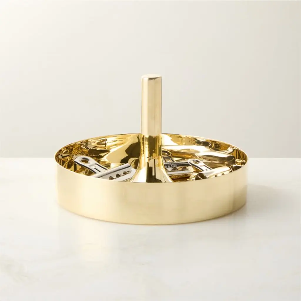 Warm brass dish from the archive of American designer Bill Curry reflects the elegant functionality of his iconic midcentury designs. Designed to be stacked with the Hierarchy pencil cup, the dish elevates organization in unlacquered brass, offering a living finish that will develop the patina of a vintage find. CB2 exclusive.