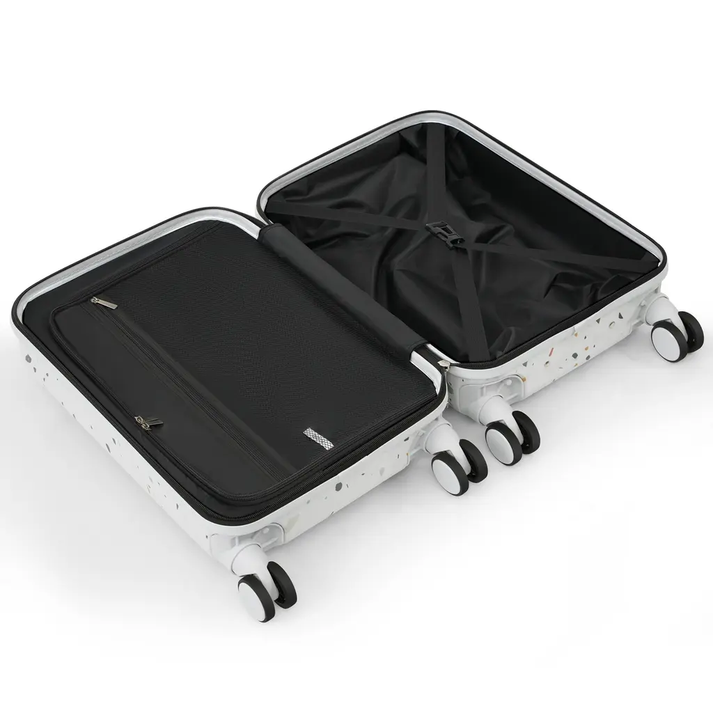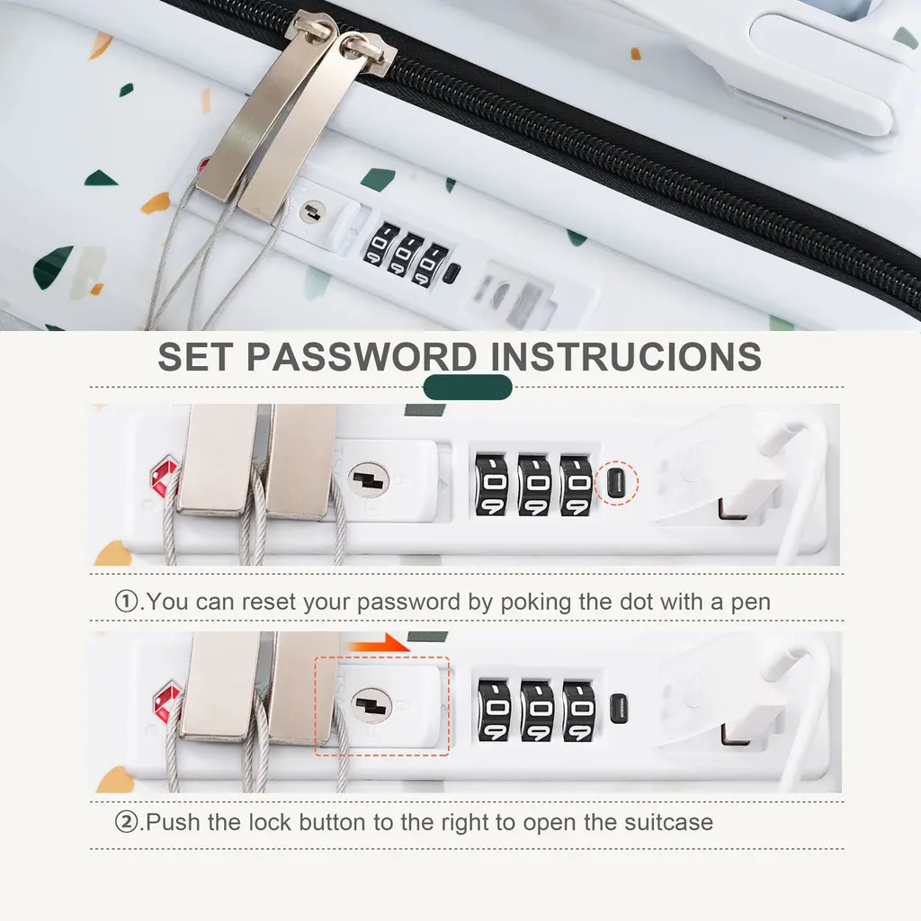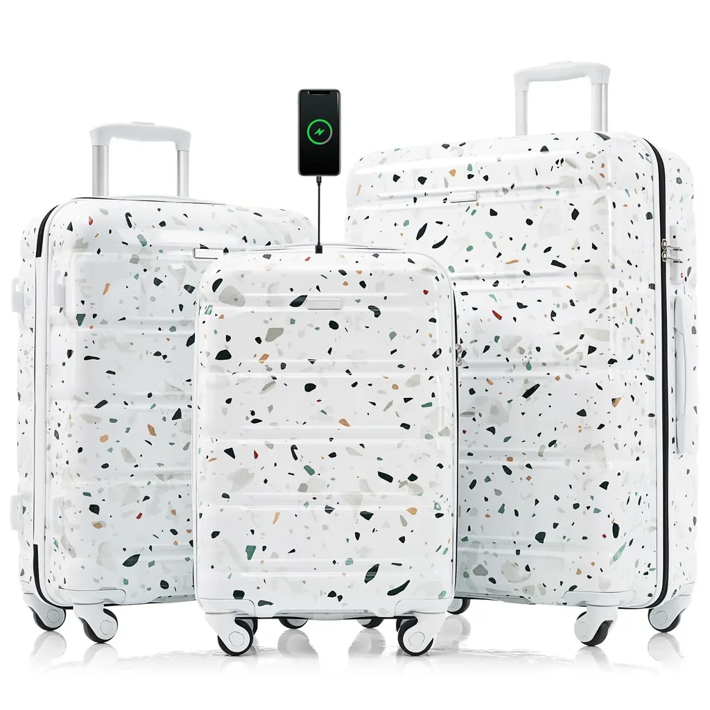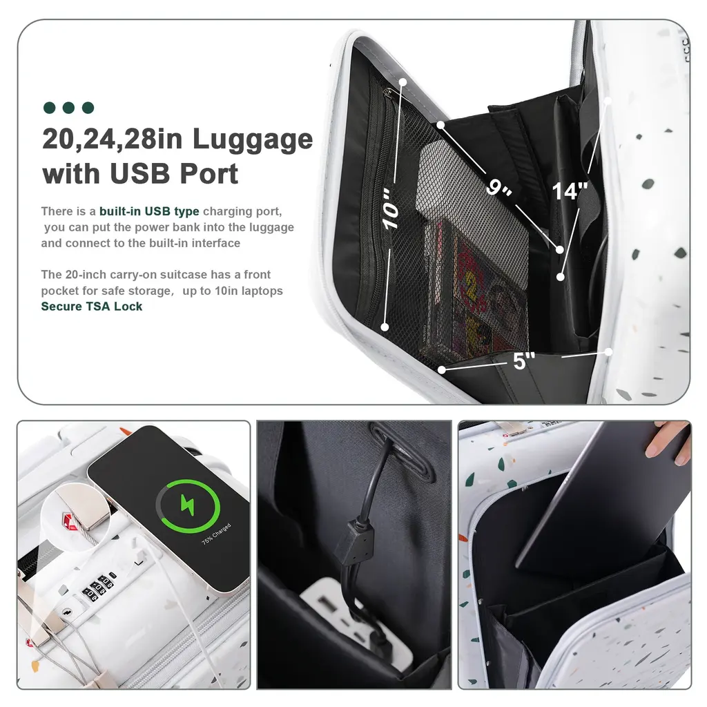 Make every journey effortless with this feature-packed 3-piece luggage set, including 20", 24", and 28" suitcases crafted from durable ABS+PC material. The 20" and 24" cases feature convenient front openings for easy access, while all three include USB charging ports (power bank not included) to keep your devices powered on the go.Features:Quick Glance Highlights: