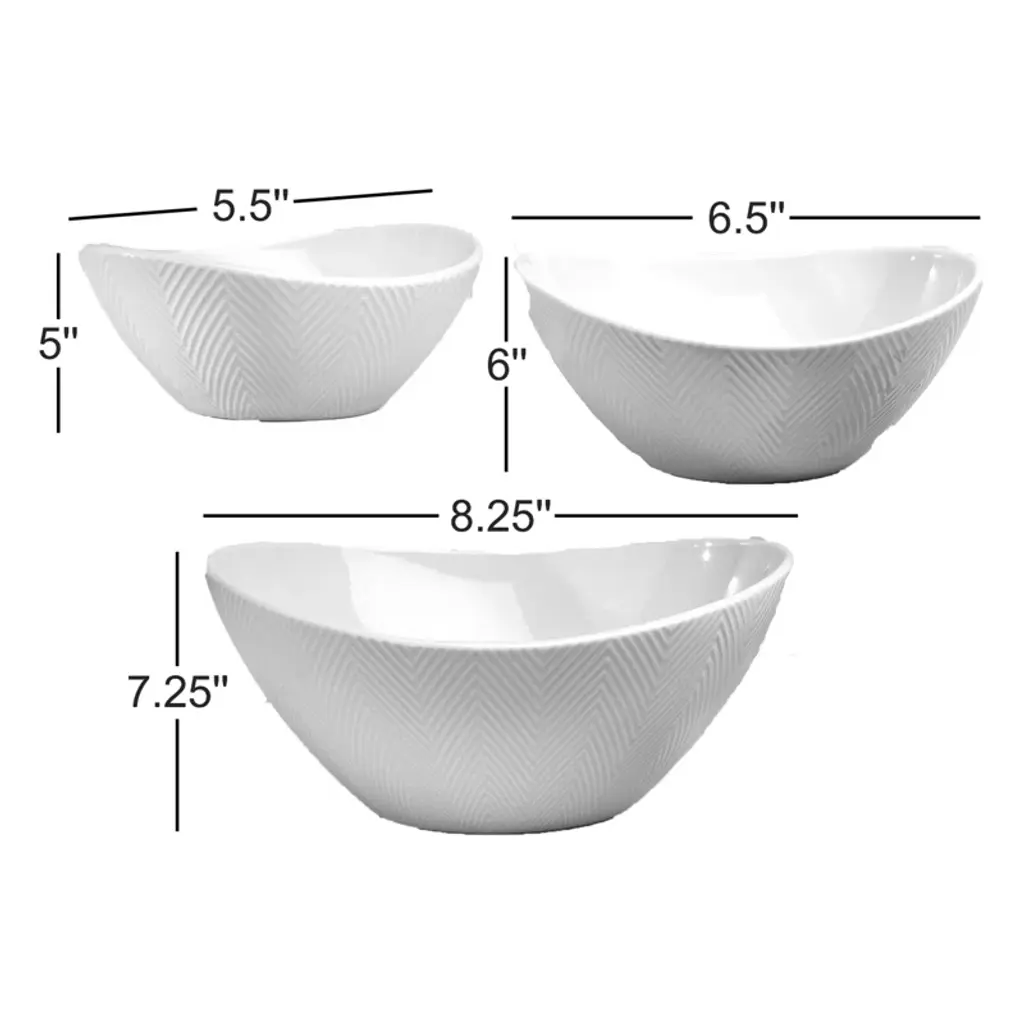 Modern white chevron textured surface will add an element of uniqueness and stylish simplicity to your dining and entertaining experiences. The sophisticated semi-oval, scoop shape of this set of 3 round bowls makes it a perfect choice to bring it out during special occasions.