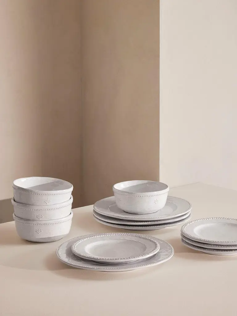 Crafted from robust Tuscan stoneware, the latest additions to our signature Hillcrest range are washed in a white glaze and handmade by skilled Italian artisans who have been producing ceramics in a village outside Florence for 40 years. Drawing on the rustic interiors at Soho Farmhouse, each piece is embellished by hand, with the individual marks of the maker adding charm and character. This 12-piece set is ideal for everyday family dining, featuring four dinner plates, four side plates, and four cereal bowls.