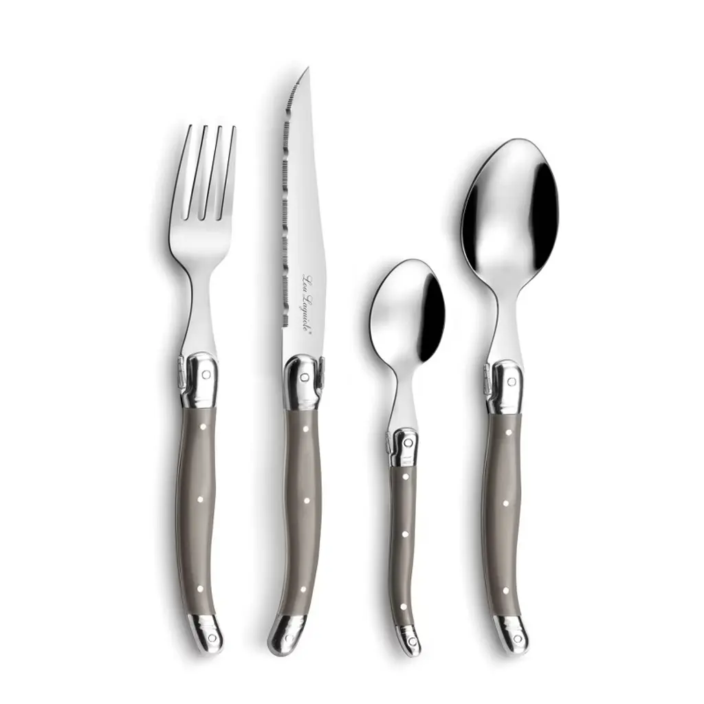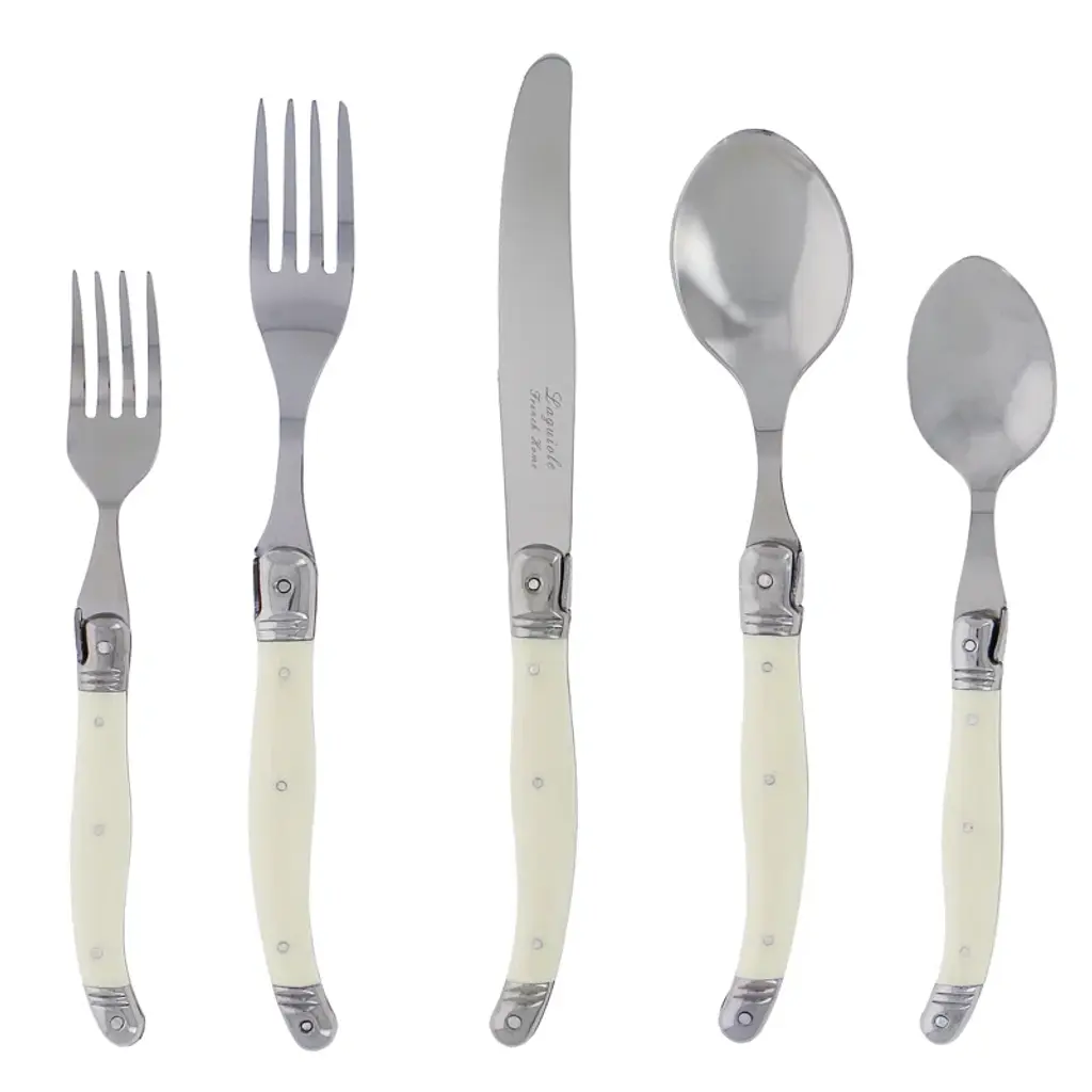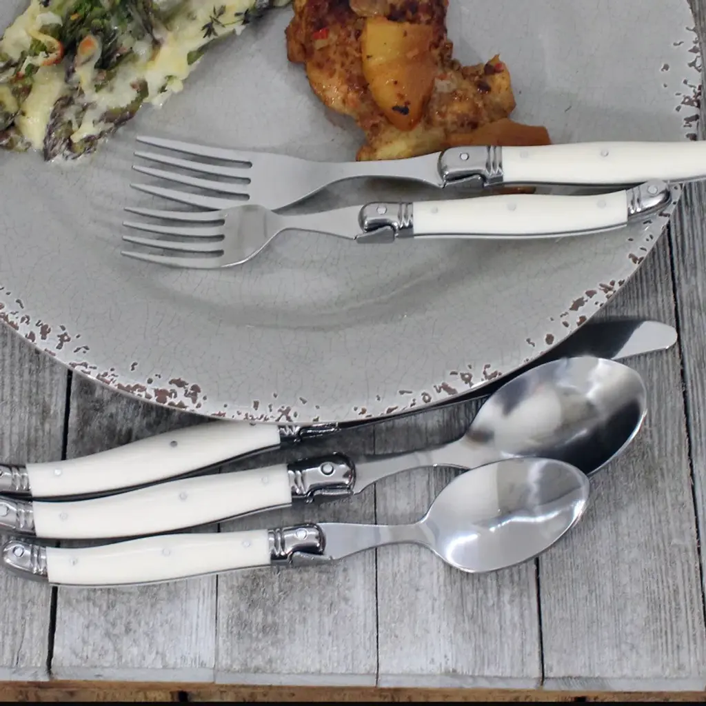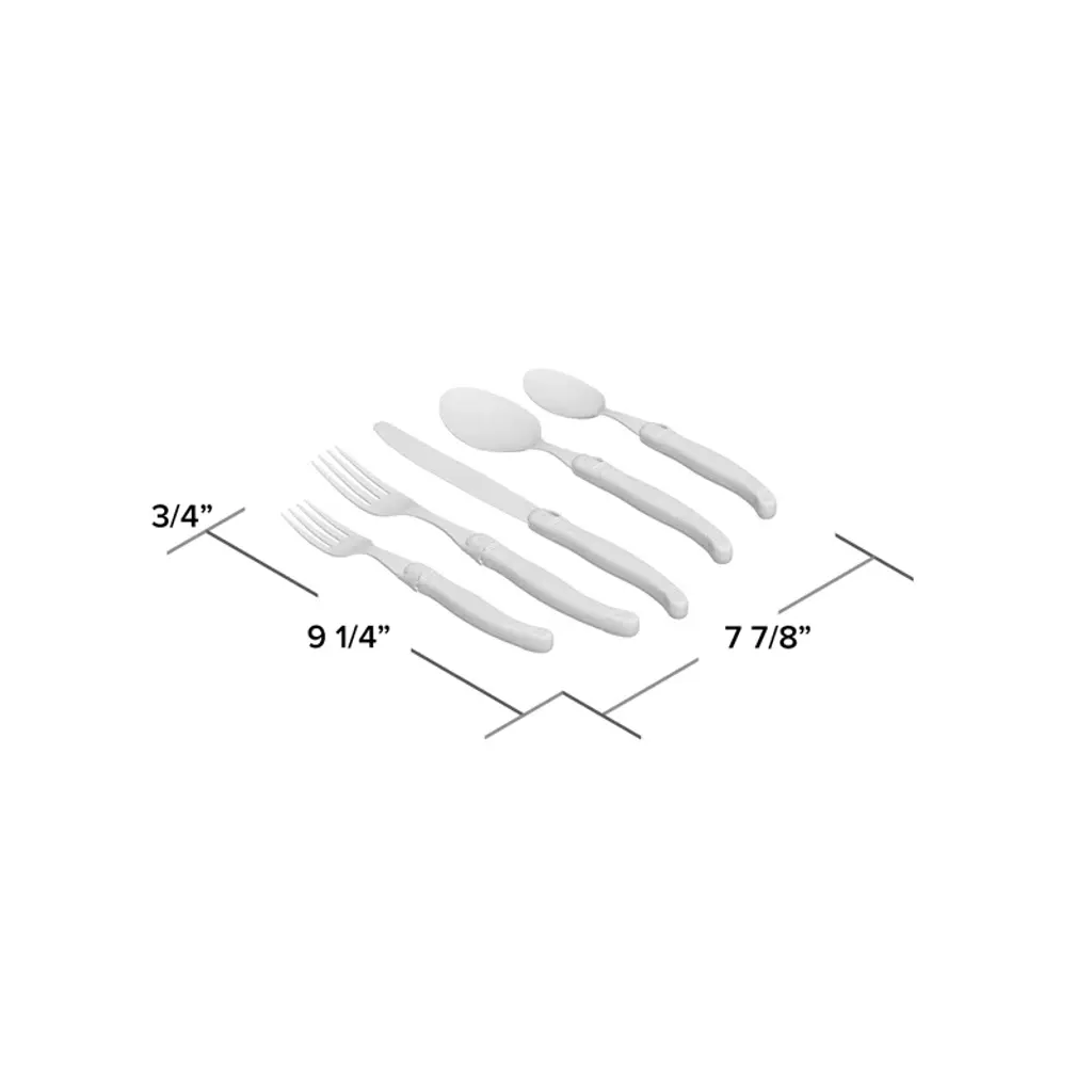 Give mealtime a fresh look with this Flatware Set. Perfect for casual meals with friends and formal meals with friends. This set is crafted from stainless steel, with plastic handles, and includes enough pieces for a dining party of four, with four dinner knives, four dinner forks, four soup spoons, four salad forks, and four dessert spoons. It is rust and tarnish-resistant. For easy cleaning, throw this set in the dishwasher.