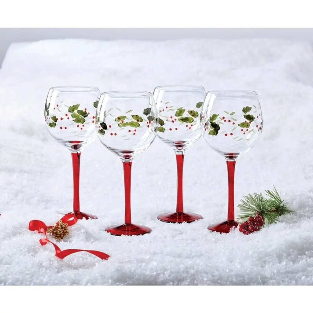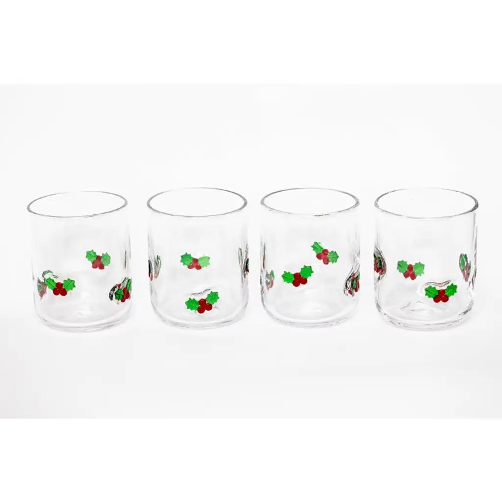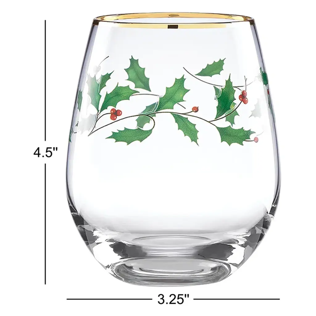Designed in our signature holly leaf pattern, this 4-piece stemless wine glass set is perfect for serving up rich wine or festive cocktails for your next holiday party.