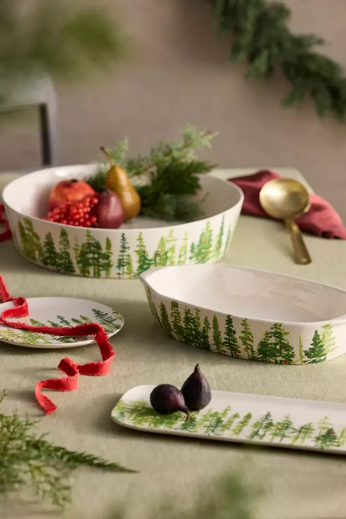 Handmade in Italy especially for terrain, this oblong stoneware serving dish is illustrated with a festive fir forest.