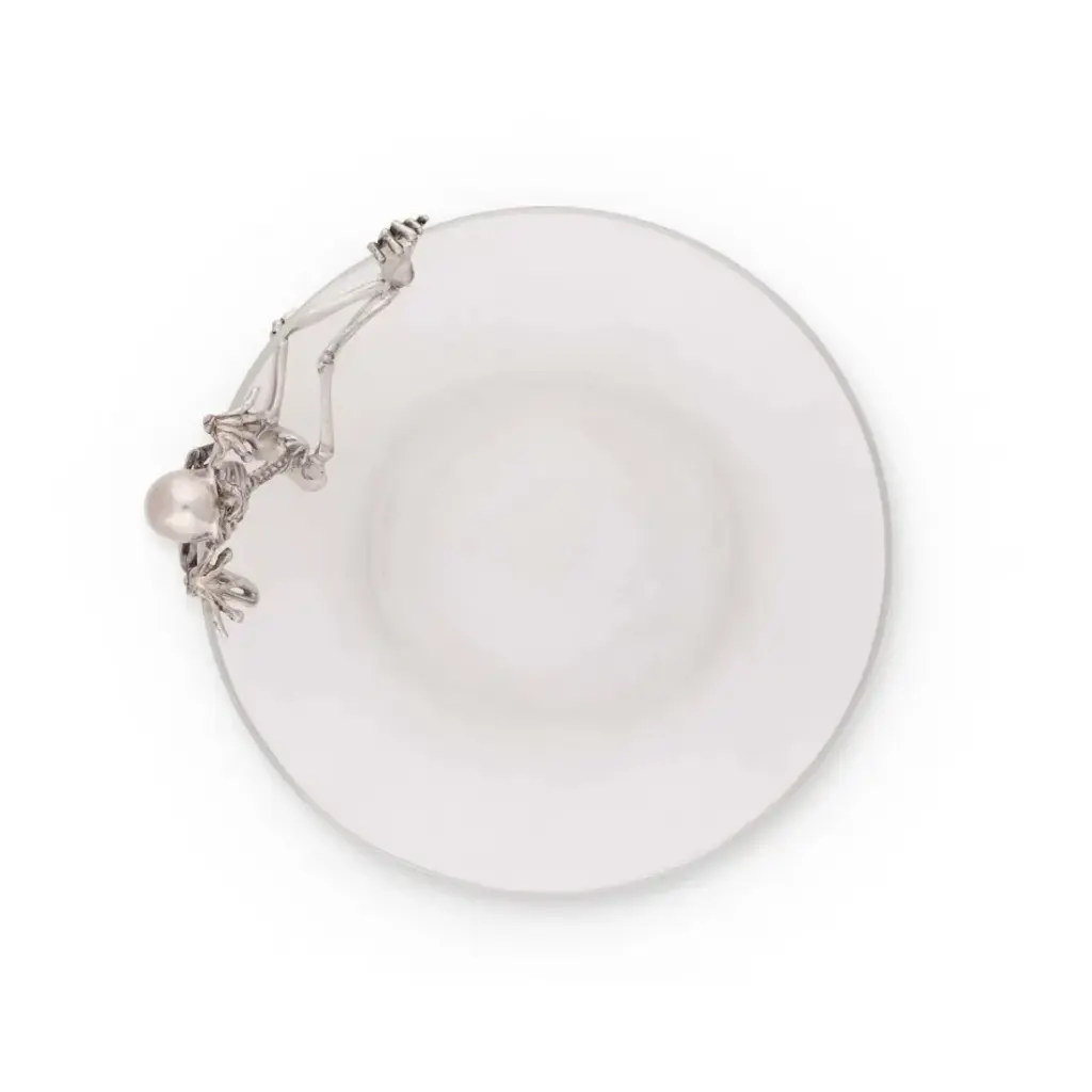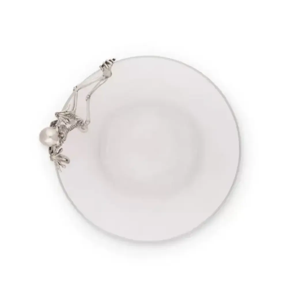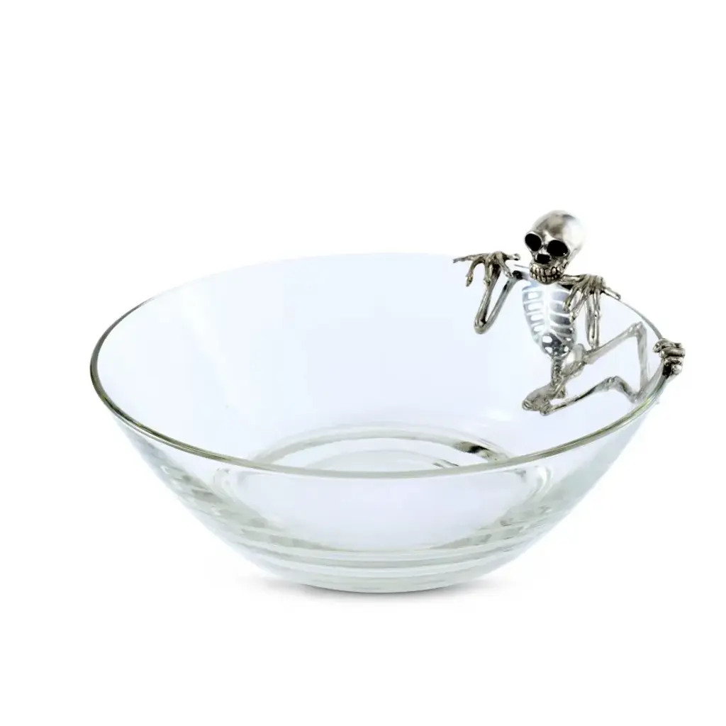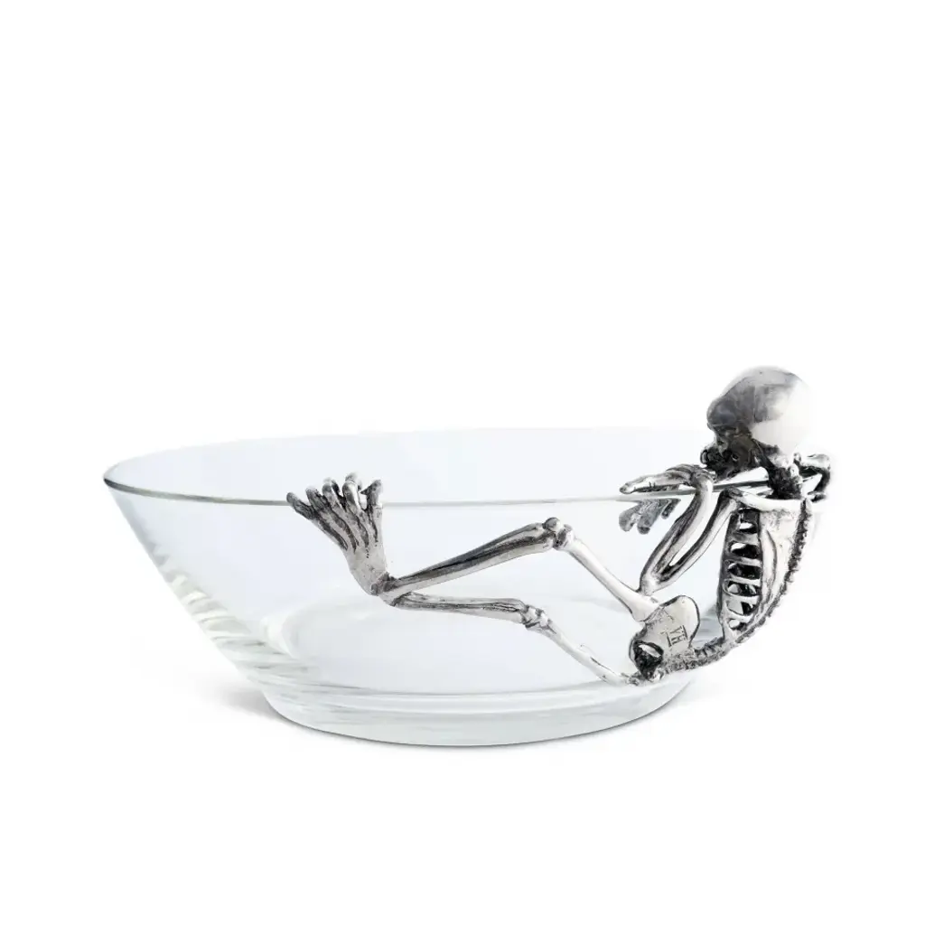 Bones, Vagabond House’s signature, pure pewter skeleton figural is literally hanging out on our crystal-clear candy dish. Suggested for candy, medium sized for whatever you desire to serve. Bone’s will be waiting to check out the goodies and entertain your guests. Vagabond House’s Skeleton embellished products are inspired by traditional and elaborate sugar skulls and skeletons created to celebrate Día de los Muertos. Our minimalist skeleton decorated products are also perfect at Halloween, Mardi Gras, mystery dinners; any time a suggestion of intrigue and danger adds festive fun to a celebration. Vagabond House is a family-owned American company specializing in fine pewter tableware, servingware and giftware. Largely inspired by nature, their exclusive products are designed to be unique, functional heirlooms for those who seek to express tradition and style in both family and formal entertaining.