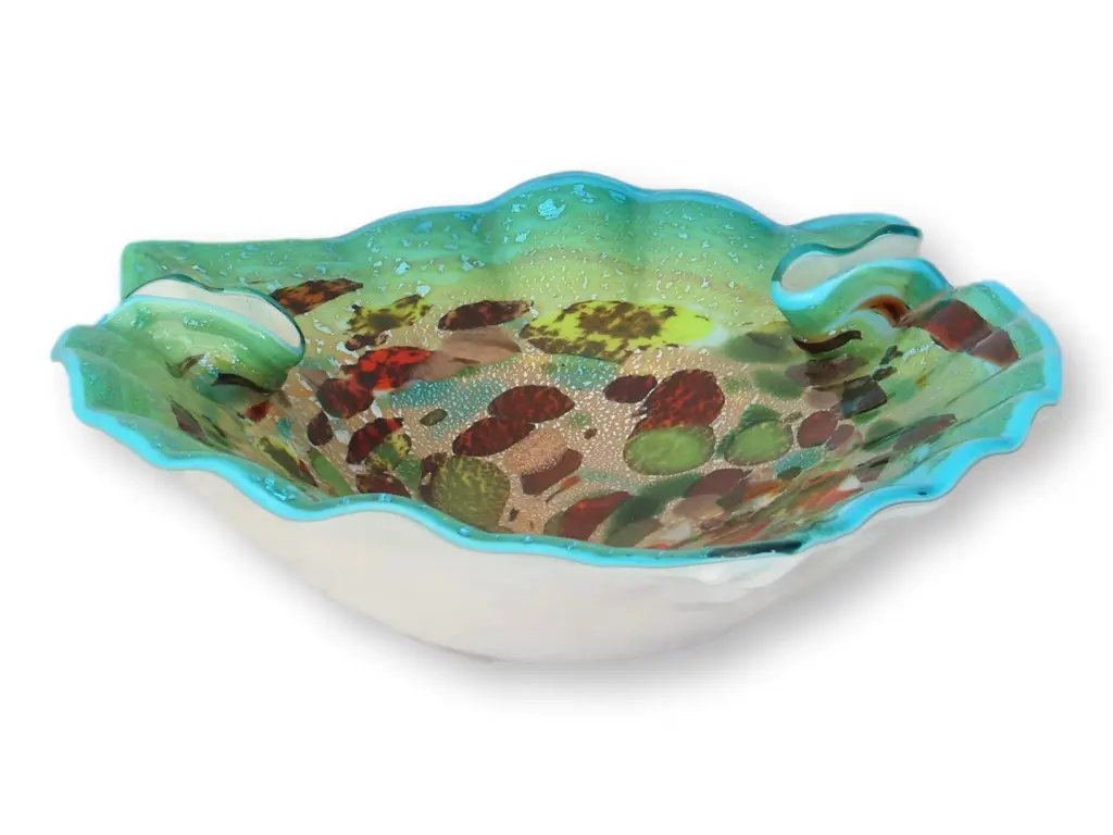 The 8-inch rainbow Murano glass wavy serving bowl is a stunning centerpiece for any dining experience. Crafted from exquisite art glass, this serving bowl combines functionality with artistic flair. Its wavy scalloped shape combines with vibrant colorations to bring a cheerful ambiance to your space, enhancing the overall decor. This modern serving bowl not only elevates your serving presentation but also serves as an eye-catching decorative piece when not in use. Add this versatile bowl to your collection for a splash of color and elegance. 6-inch h x 8-inch w x 8-inch d.