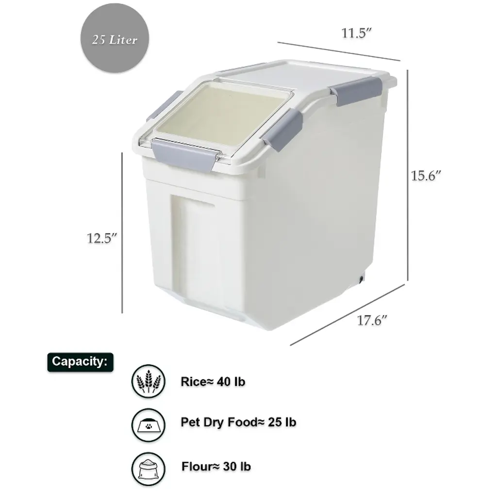 This Food Storage Container is made of food-grade PP material, BPA free. It's ideal for storing rice, flour, corn, beans, pet dry food, etc. The airtight silicone sealed cover with a flip lid and 6 locks keeps food fresh and safe, and prevents moisture and dust. It designs in five available sizes for you to choose the best option as needs. The storage container bin can be used as a rice/grain stocker, pantry storage, pet food container for dog food, cat food, or birdseed, as well as a storage bin for toys, leash, cat litter, etc.