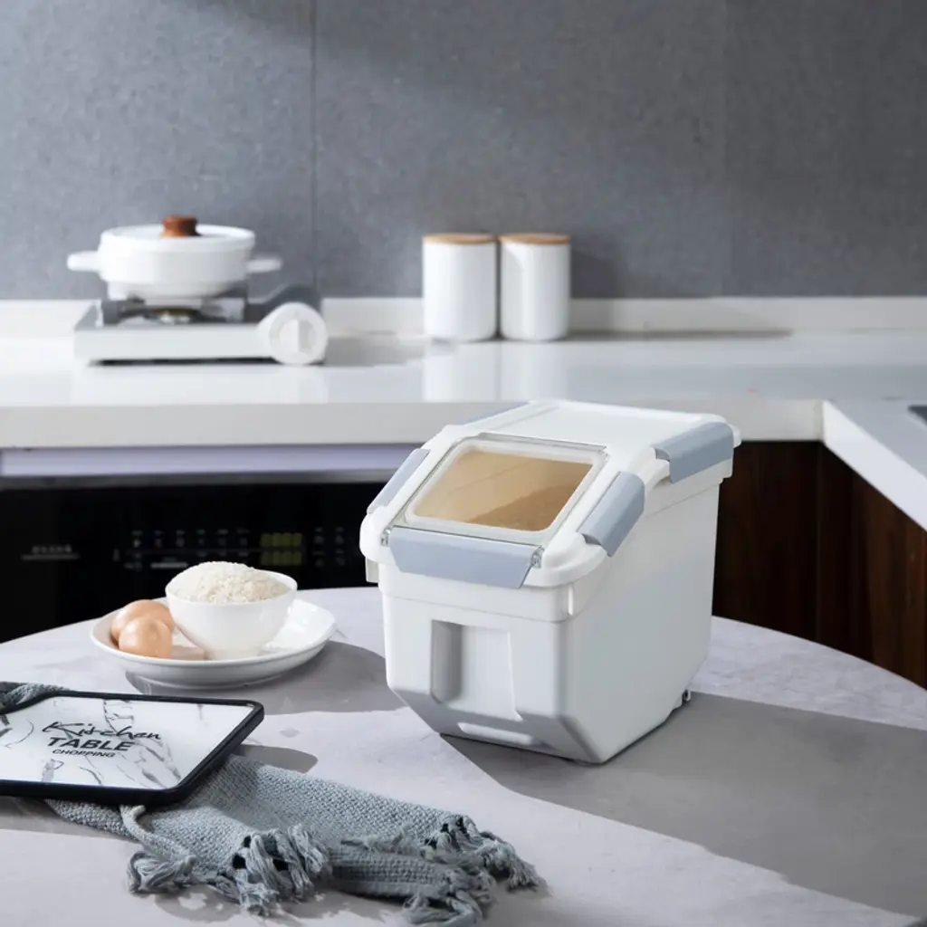 This Food Storage Container is made of food-grade PP material, BPA free. It's ideal for storing rice, flour, corn, beans, pet dry food, etc. The airtight silicone sealed cover with a flip lid and 6 locks keeps food fresh and safe, and prevents moisture and dust. It designs in five available sizes for you to choose the best option as needs. The storage container bin can be used as a rice/grain stocker, pantry storage, pet food container for dog food, cat food, or birdseed, as well as a storage bin for toys, leash, cat litter, etc.