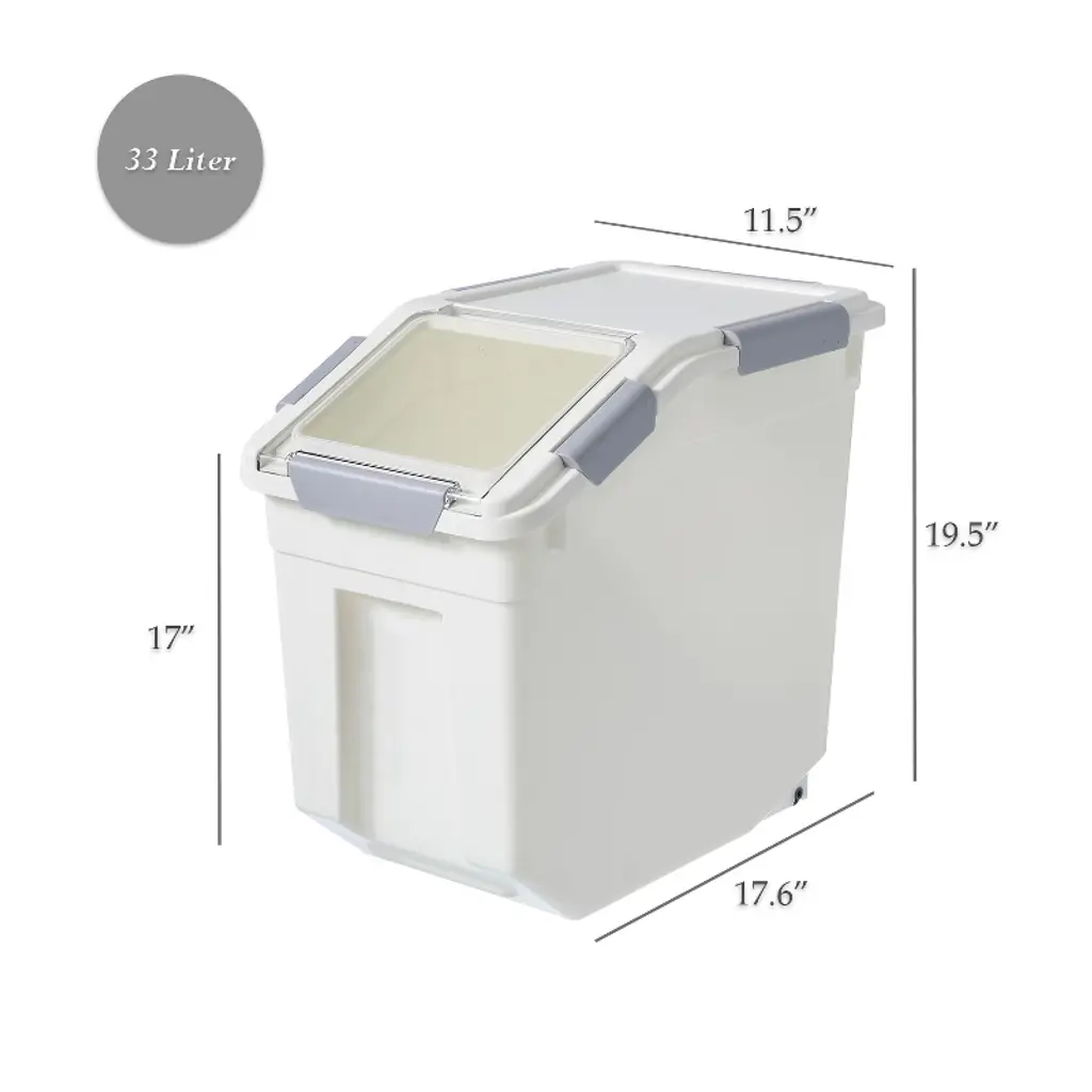 This Food Storage Container is made of food-grade PP material, BPA free. It's ideal for storing rice, flour, corn, beans, pet dry food, etc. The airtight silicone sealed cover with a flip lid and 6 locks keeps food fresh and safe, and prevents moisture and dust. It designs in five available sizes for you to choose the best option as needs. The storage container bin can be used as a rice/grain stocker, pantry storage, pet food container for dog food, cat food, or birdseed, as well as a storage bin for toys, leash, cat litter, etc.