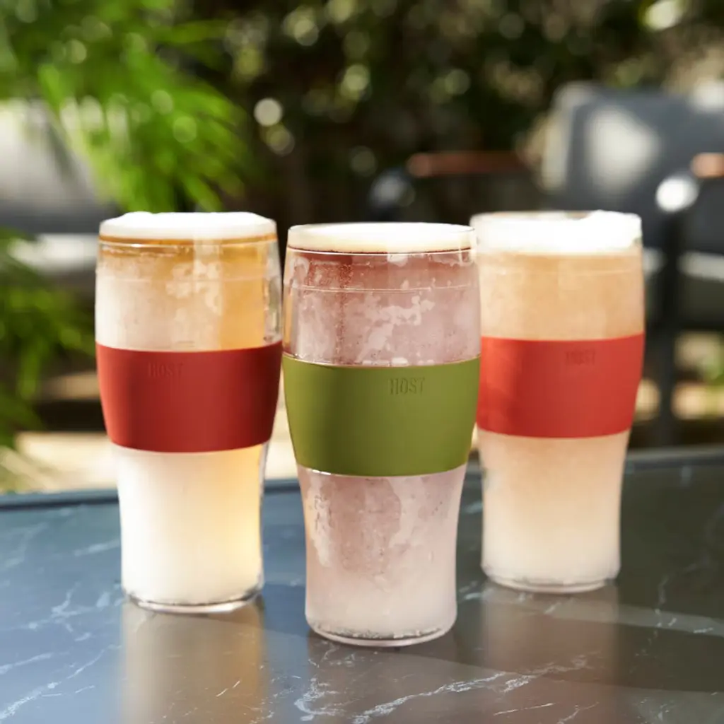 Keep your beer ice cold with the Beer FREEZE™ Cooling Cup in Olive Green. No more warm beers! Designed with double-walled insulation and proprietary active cooling gel, this pint glass keeps your favorite IPA, stout, pilsner, or cider perfectly chilled for up to 2 hours. Just pop it in the freezer upside down, and the cooling gel will freeze to create the ultimate cold brew experience. The ergonomic silicone grip ensures comfortable sipping, while the Tritan BPA-free plastic construction offers durability, making it ideal for outdoor events, tailgates, or just lounging in the sun. Quantity: 2 cups Capacity: 16 oz. Materials: Tritan BPA-free plastic and silicone Design: Insulated walls with active cooling gel Care: Hand wash Directions: Stash your Beer FREEZE™ upside down in the freezer for refreshingly cold brewskis. For best results, chill for 2+ hours before using.