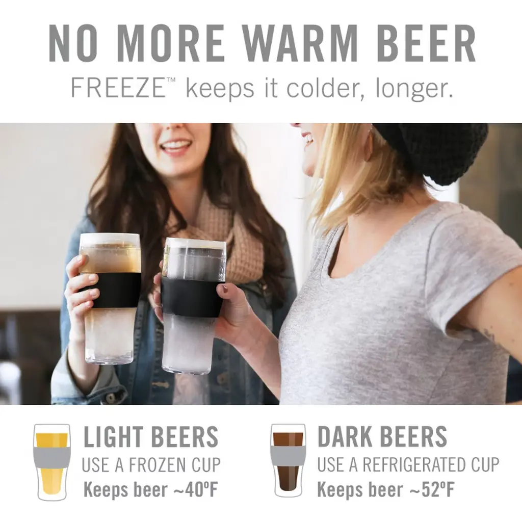 INSULATED WITH ACTIVE COOLING GEL Keep your beer cold, as the powers that be intended. Next time your buddy tosses you a cold one, make sure it’s actually cold—and stays cold. The Beer FREEZE is ready to rescue you from room temperature brews and ensure your favorite IPA stays nice and frosty for over an hour. Just chill the double-walled pint upside down in the freezer for at least 2 hours to freeze the active cooling gel. Capacity: 16 oz. Set of 2 Materials: BPA-free plastic, stainless steel, silicone Design: Insulated walls with active cooling gel Care: Hand wash Directions: Stash your Beer FREEZE upside down in the freezer for refreshingly cold brewskis. For best results, chill for 2+ hours before using. Beer Nerd Tip: For a classic lawn mower beer that’s best ice cold, we like to freeze the pint glass thoroughly. If you’re sipping fancy craft brews, we recommend stashing your Beer FREEZE in the fridge for the ideal IPA or Sour tasting temperature.
