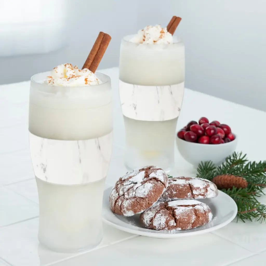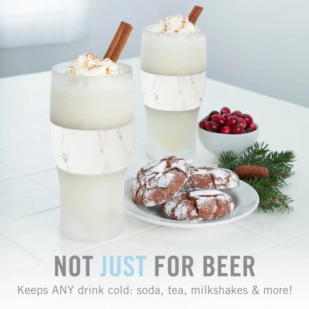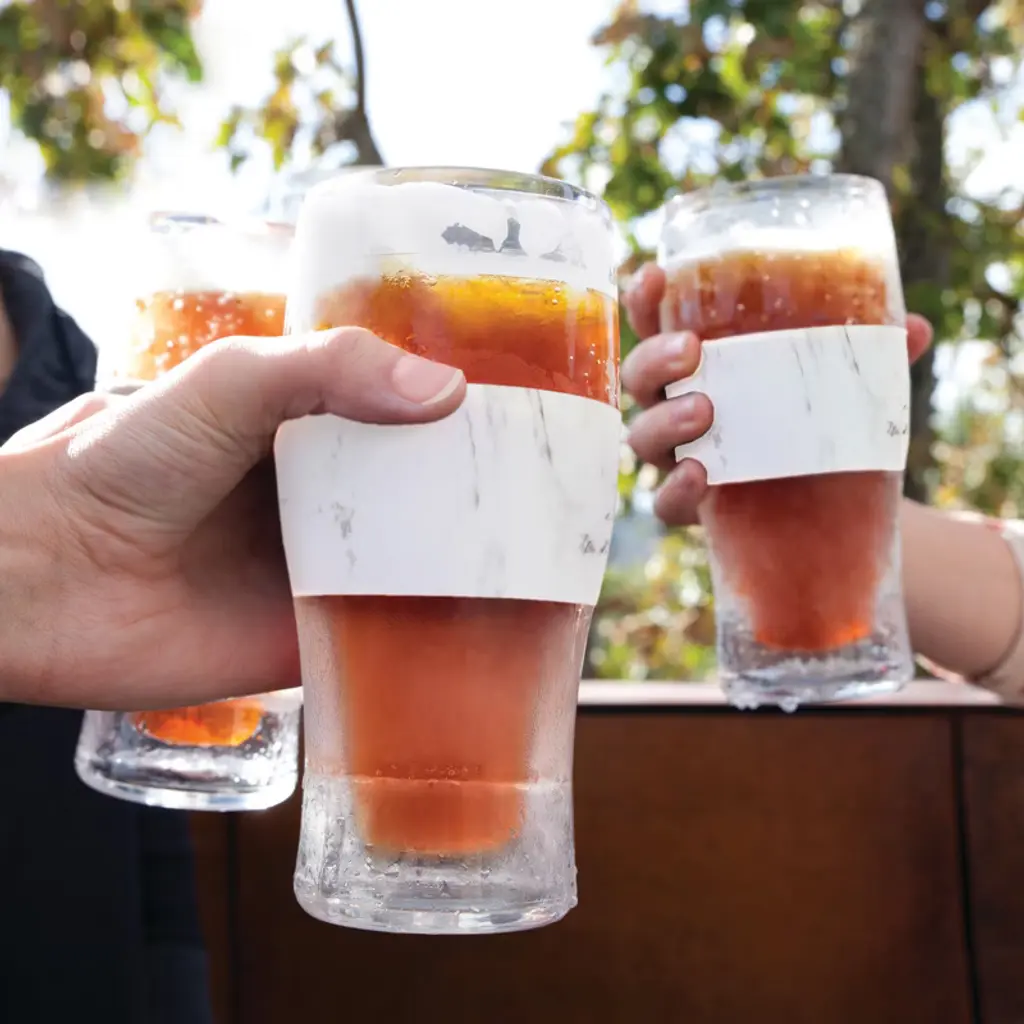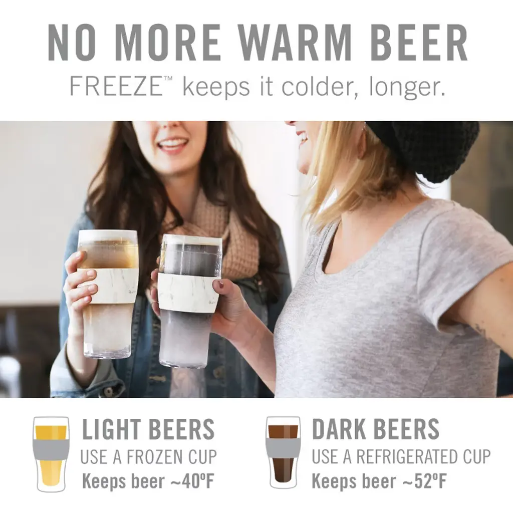INSULATED WITH ACTIVE COOLING GEL Keep your beer cold, as the powers that be intended. Next time your buddy tosses you a cold one, make sure it’s actually cold—and stays cold. The Beer FREEZE is ready to rescue you from room temperature brews and ensure your favorite IPA stays nice and frosty for over an hour. Just chill the double-walled pint upside down in the freezer for at least 2 hours to freeze the active cooling gel. Capacity: 16 oz. Set of 2 Materials: BPA-free plastic, stainless steel, silicone Design: Insulated walls with active cooling gel Care: Hand wash Directions: Stash your Beer FREEZE upside down in the freezer for refreshingly cold brewskis. For best results, chill for 2+ hours before using. Beer Nerd Tip: For a classic lawn mower beer that’s best ice cold, we like to freeze the pint glass thoroughly. If you’re sipping fancy craft brews, we recommend stashing your Beer FREEZE in the fridge for the ideal IPA or Sour tasting temperature.