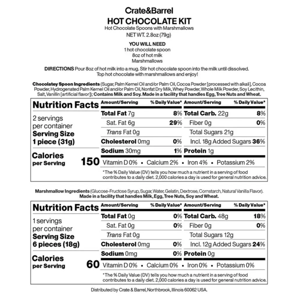 Warm up your winter evenings with a cup of decadent hot chocolate. Kit includes two wooden spoons coated with chocolate and crushed peppermint and six delightful, snowflake-shaped marshmallows. With its ready-to-gift packaging, this kit makes a sweet surprise for anyone who adores hot chocolate.