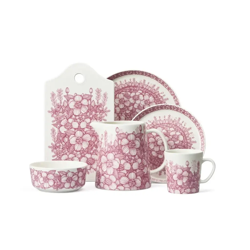 Arabia’s Huvila plate is adorned with delicate pink flowers drawn by Heini Riitahuhta. Huvila is Finnish for a villa, and the nostalgic floral pattern breathes the atmosphere of warm childhood summers at grandma’s house. With influences from the 1920’s decorative motifs, the contemporary Huvila collection continues Arabia’s decorating tradition in a charming manner.
