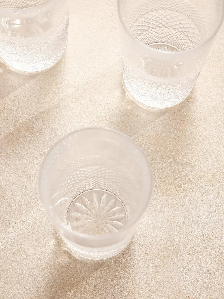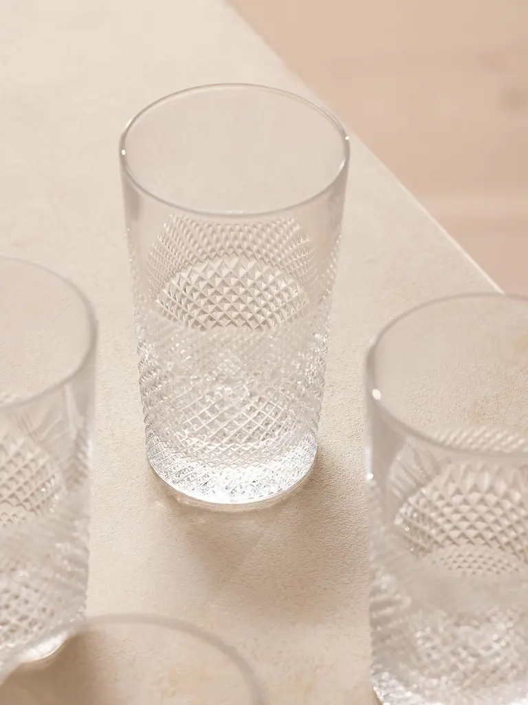Our Huxley crystal glassware has been crafted to elevate your drinking experience. The intricate design is inspired by Little House Mayfair as well as classic Regency-era design, with attention spent on every piece by a set of skilled craftspeople in Slovenia. Each glass is cut, polished and finished by hand to achieve brilliant clarity and sparkle, with a satisfying weighty feel. Featured is this set of four highball glasses, ideal for longer refreshing drinks and cocktails.